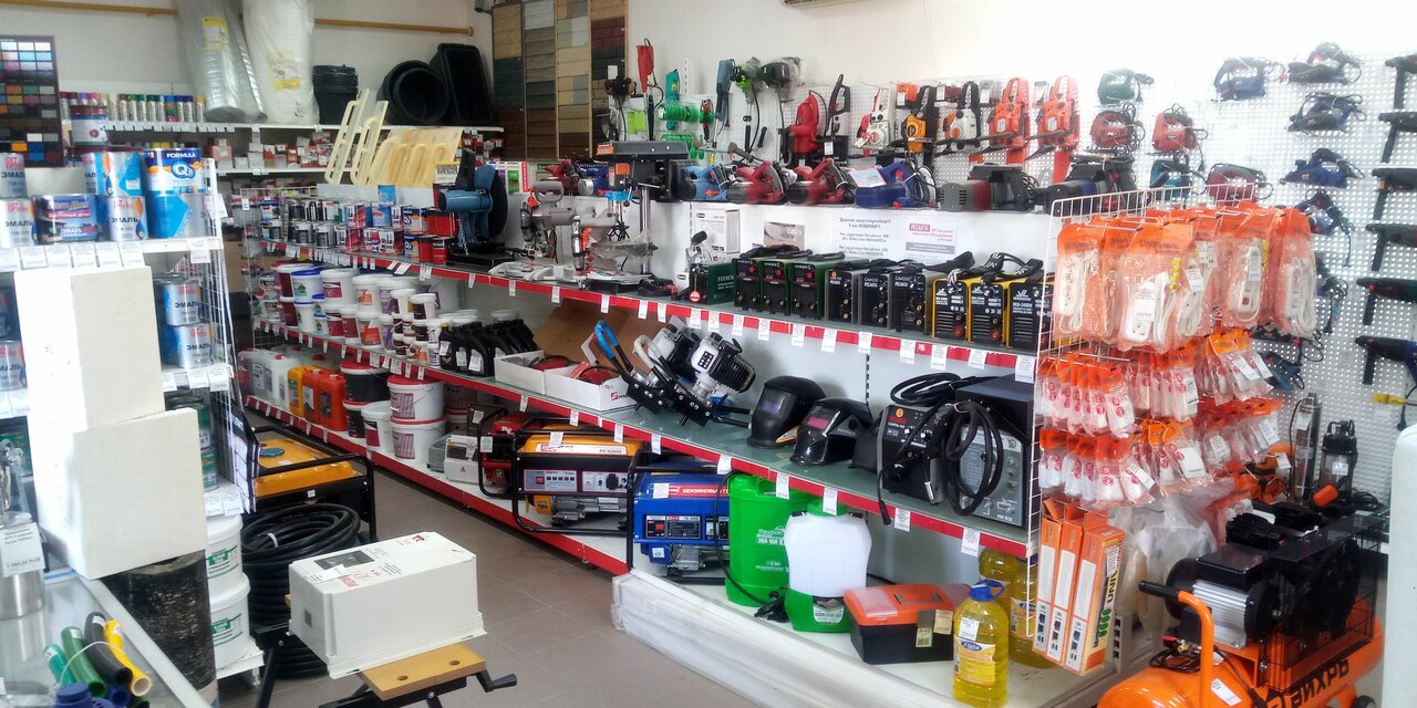 Обычный магазин с разным ассортиментом. От краски до инструмента и расходников.