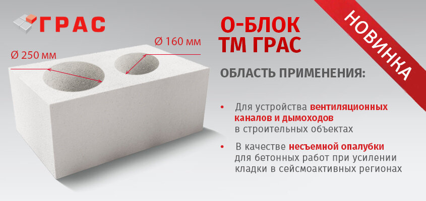 Одним из направлений предприятий ДСК ГРАС является выпуск качественных газобетонных О-блоков длиной 600 мм с одним или двумя сквозными отверстиями диаметром 160 мм и (или) 250 мм, изготовлены путем выпиливания на специальном оборудовании.
