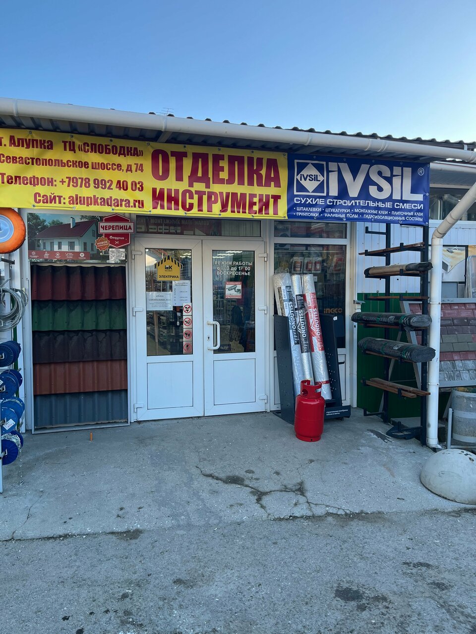 В Алупке единственный строймаг с широким ассортиментом — для стройки все есть, а того, чего нет — под заказ привозят. По ценам — терпимо, есть дисконтная карта — у меня 5%, как у многих, но, вроде бы и побольше скидки есть. Можно оплачивать картой любого материкового банка. Есть своя доставка по адекватным ценам. Полезный магазин)