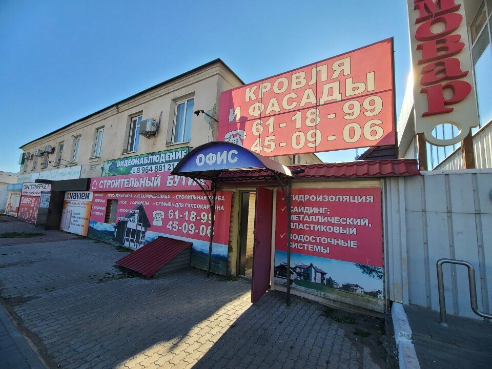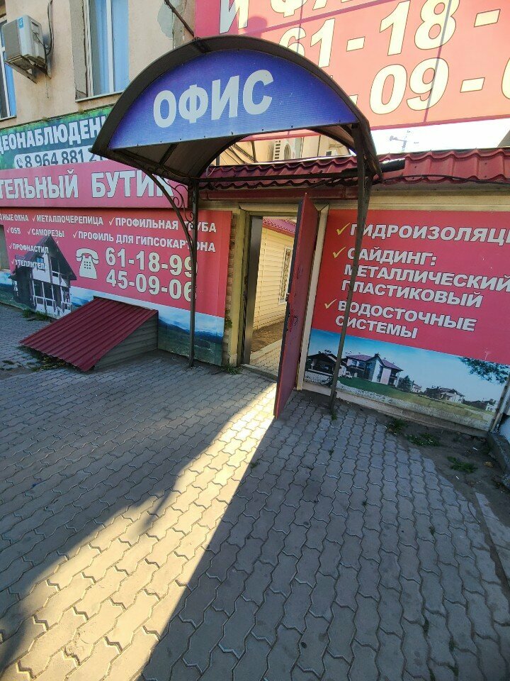 Строительный бутик (Астрахань) — магазин строительных материалов, предлагающий широкий ассортимент кровельных покрытий: фальцевую и сланцевую кровлю, черепицу, профнастил и металлочерепицу. Расположен по адресу: ул. Николая Островского, 148Ж. Режим работы: пн-пт 08:00–17:00, сб 08:00–13:00. Контакты: +7 (8512) 61-18-99, +7 (8512) 45-09-06. Сайт: (http://astrbutik.ru/).