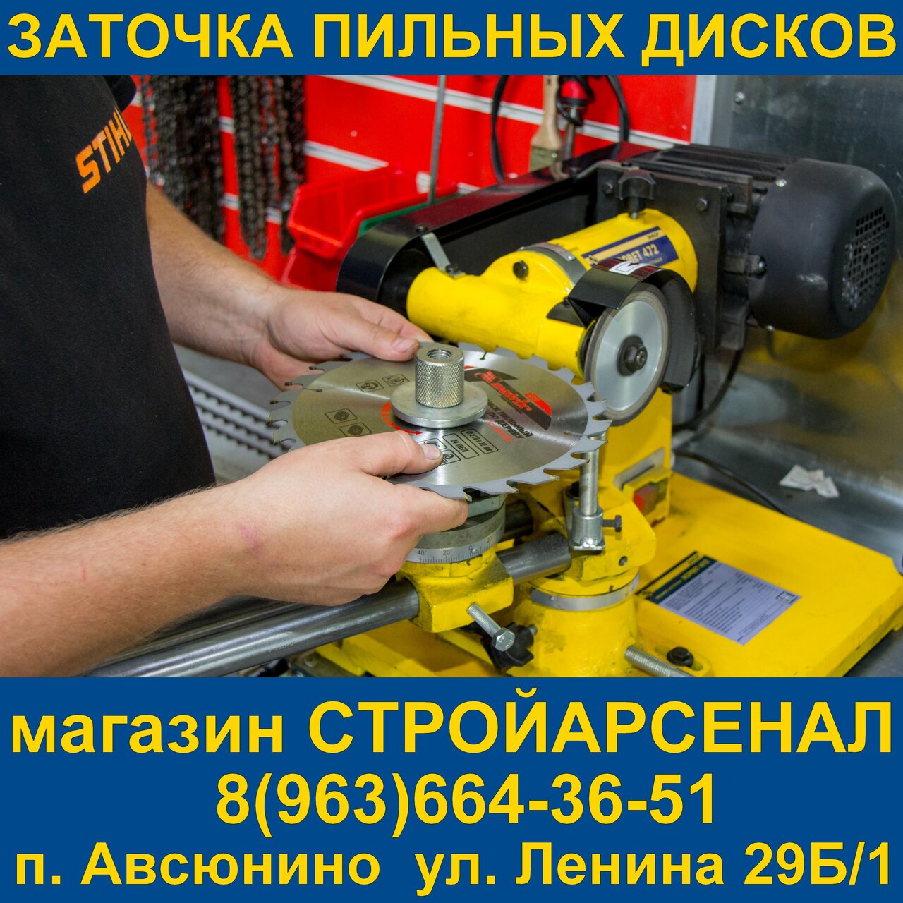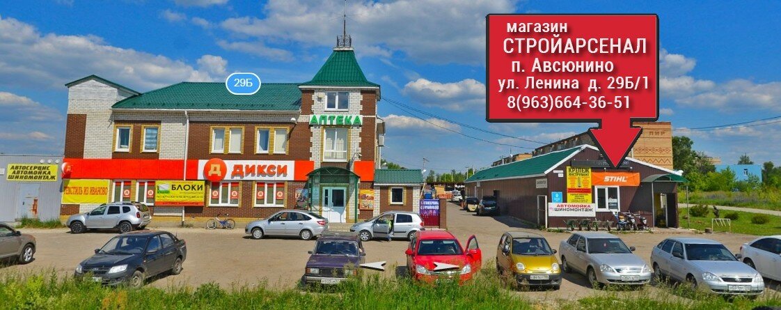 Стройарсенал – строительный магазин в Авсюнино (ул. Ленина, 29Б/1), предлагающий широкий ассортимент товаров для ремонта и отделки. В наличии режущий инструмент, услуги по ремонту бензоинструмента и аренде оборудования. Работает ежедневно с 09:00 до 19:00. Контакты: +7 (926) 135-76-45, +7 (963) 664-36-51. Подробнее на сайте: (http://stroy-ars.ru/).