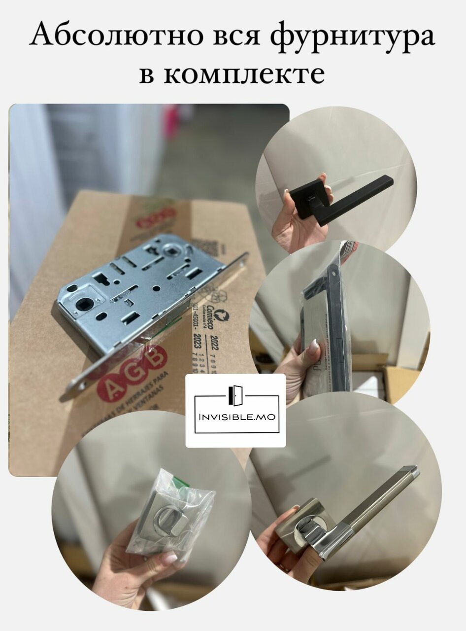 За 21 500 вы получаете КОМПЛЕКТАЦИЯ-полотно грунтованное в черной кромке;-коробка alum;-петли AGB 2.0 Eсlipse Италия.ПОДАРОК-магнитный бесшумный замок;-сантехнический фиксатор;-комплект дверных ручек.