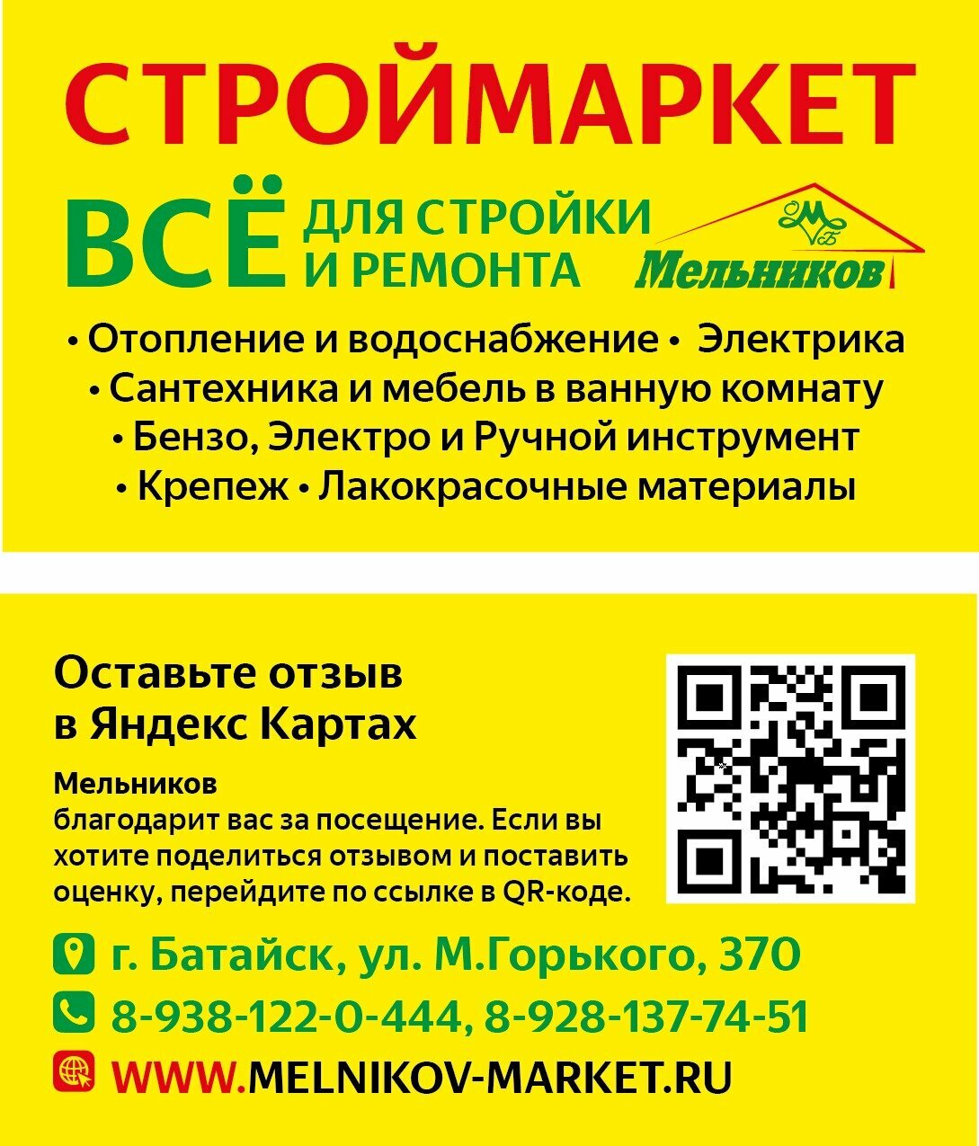 Мельников в Батайске по адресу улица Максима Горького, 370: каталог товаров, официальный сайт, цены, режим работы, отзывы посетителей, номер телефона.