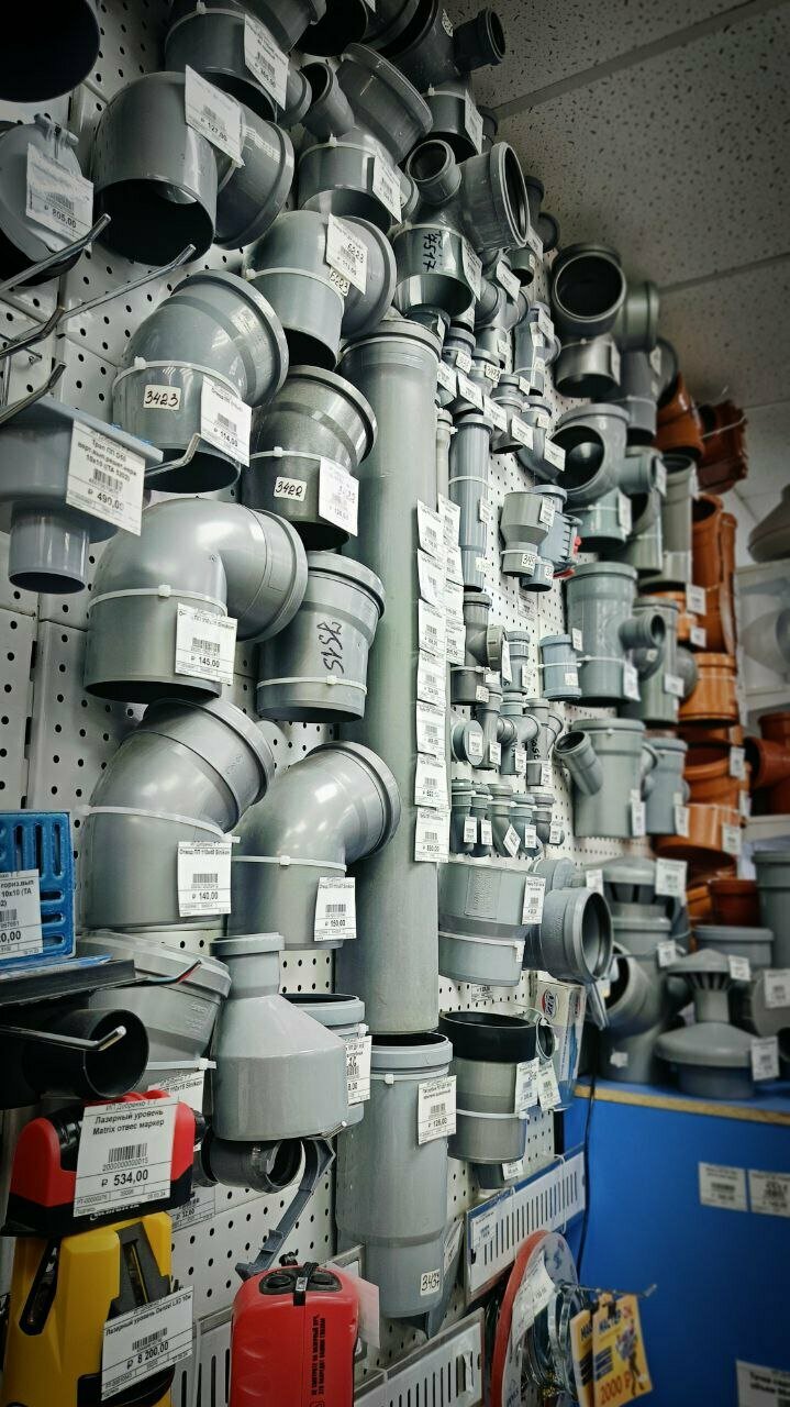 Фурнитура и сантехника, всё в целом по адекватным ценам. Есть даже отопительные котлы разных размеров с градусниками, что очень радует.