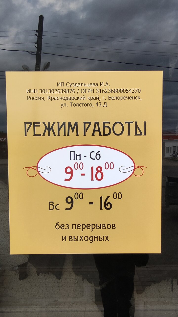 Адрес: ул. Толстого, 43Д Телефон: +7 (86155) 3-13-95 Режим работы: Пн–Сб: 09:00–18:00 Вс: 09:00–16:00