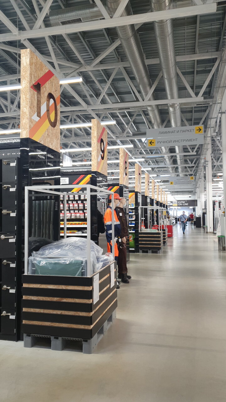 Строительный магазин топ уровня , приятный , чистый, ассортимент хороший, персонал дружелюбен и готов всегда прийти на помощь , оформление очень стильное . Иногда нет в наличии необходимых товаров , например плиточного клея КМ и покупка 4х мешков строительной смеси может растянуться на 40 минут, оформление в зале , встать на указанный номер парковки , ждать пока доставят до машины со склада- а там собирают часто несколько заказов на один погрузчик наверное для экономии времени