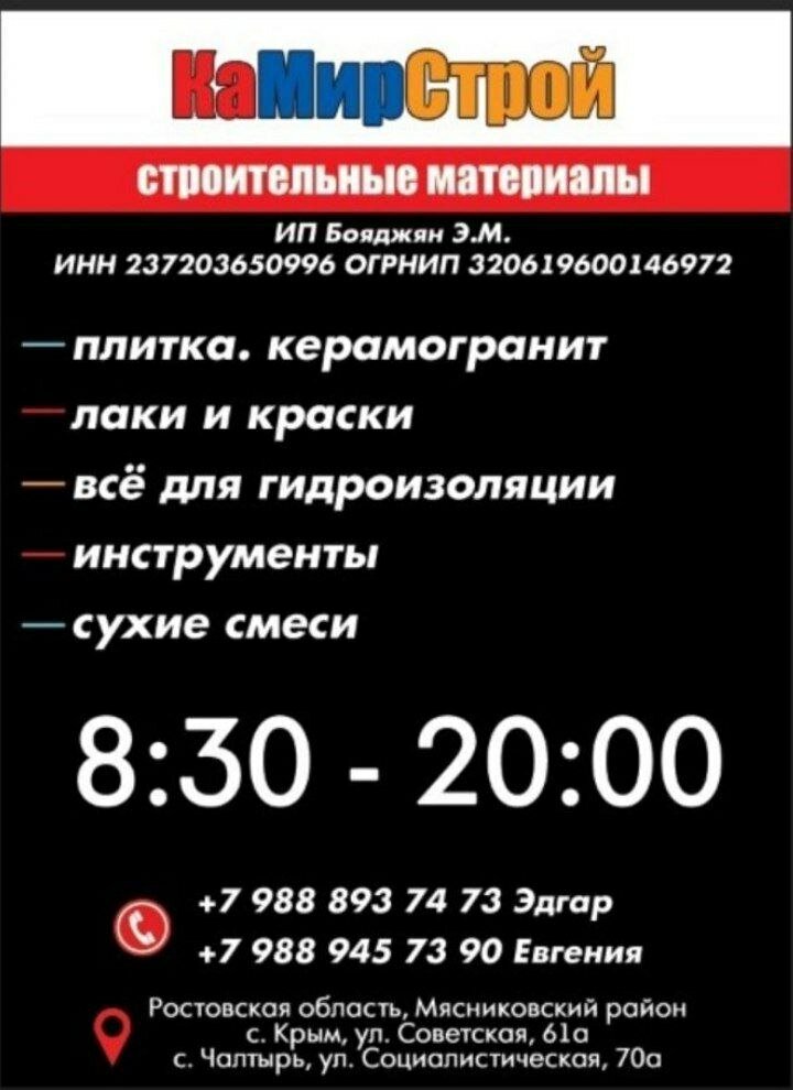 КаМирСтрой — строительный магазин в Чалтыре, расположенный по адресу: ул. Социалистическая, 70А. Ассортимент включает материалы, инструменты и товары для строительства, ремонта и отделки. Режим работы: пн-сб 08:30–20:00, вс 09:00–20:00. Контактный телефон: +7 (988) 945-73-90 (Евгения). Сайт не указан.