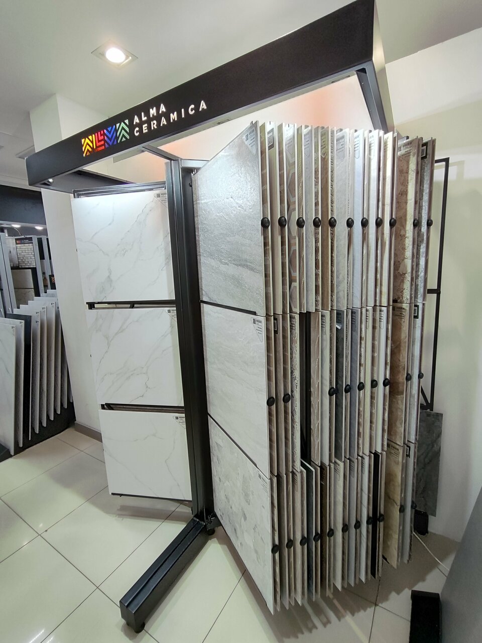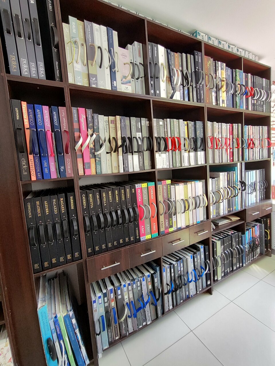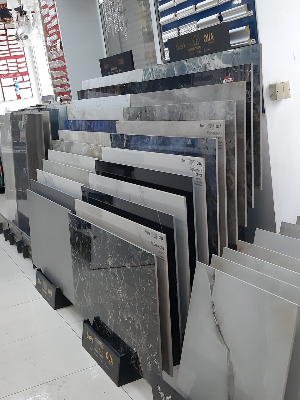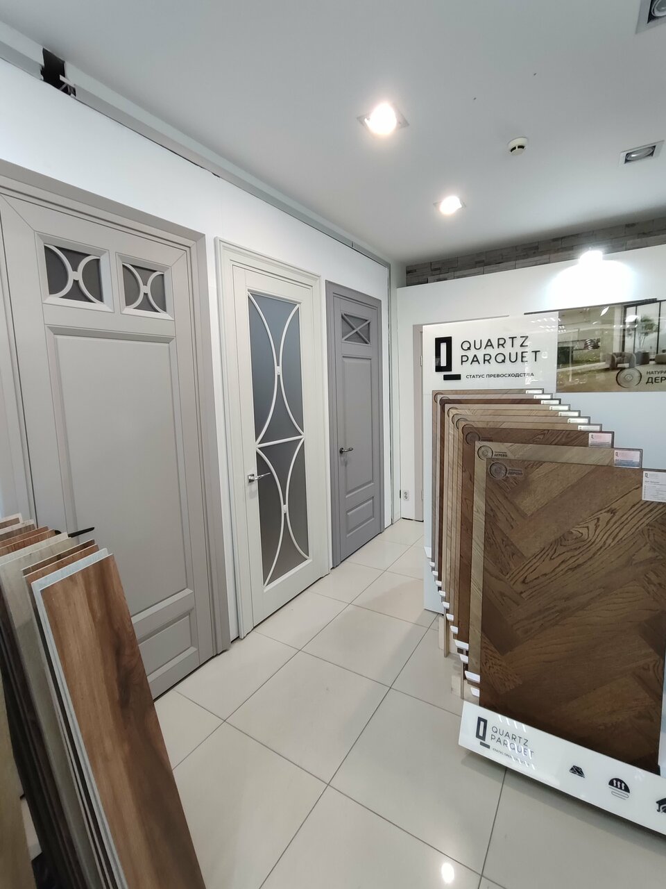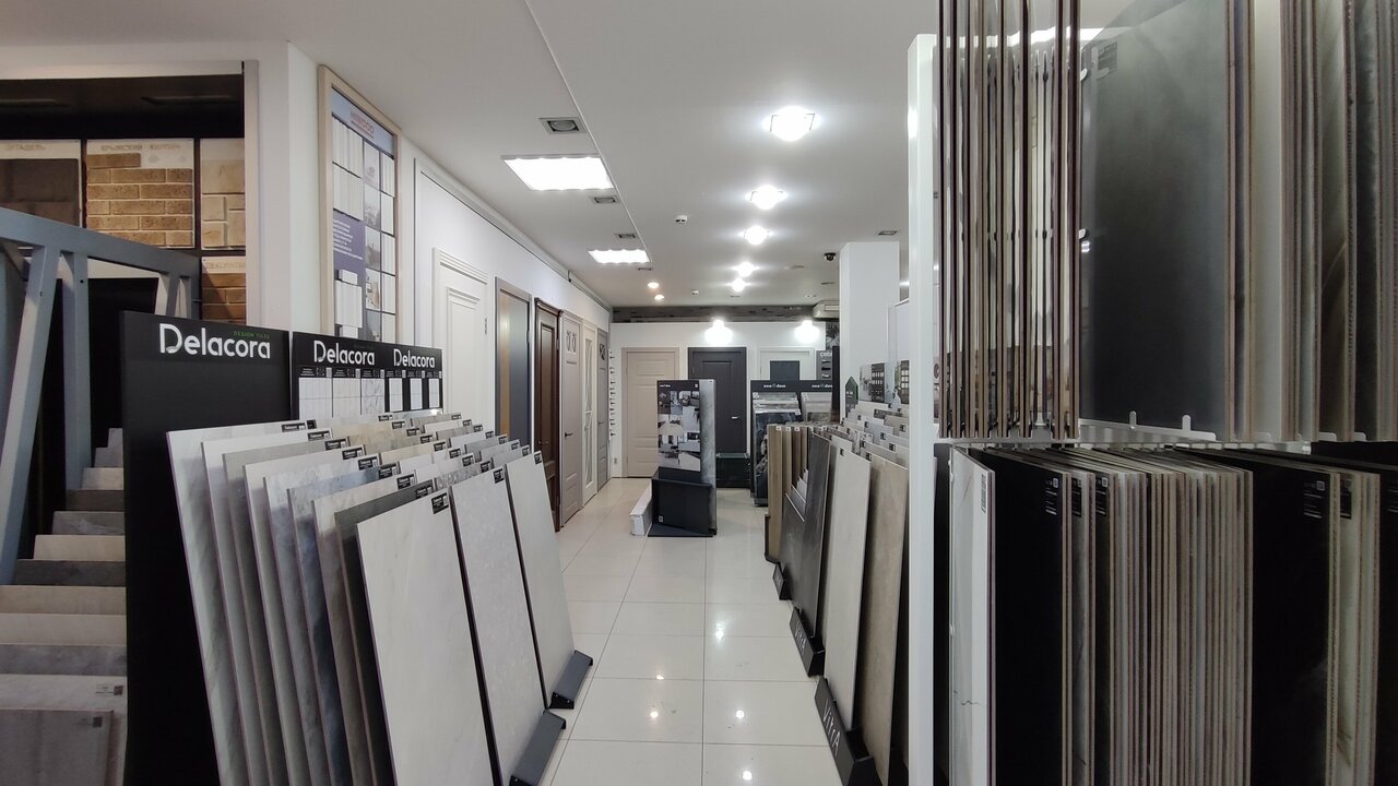 - Большой выбор плитки, обоев, ламината и дверей