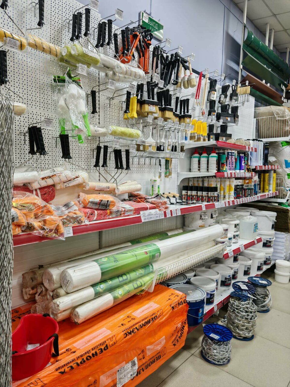 Очередей нет. А есть всё!!! ‘От бинта до ваты’, как говорится. Помимо труб и профлиста и поликарбоната взяли и электроды, и диски, и перчатки, и краску в одном месте.