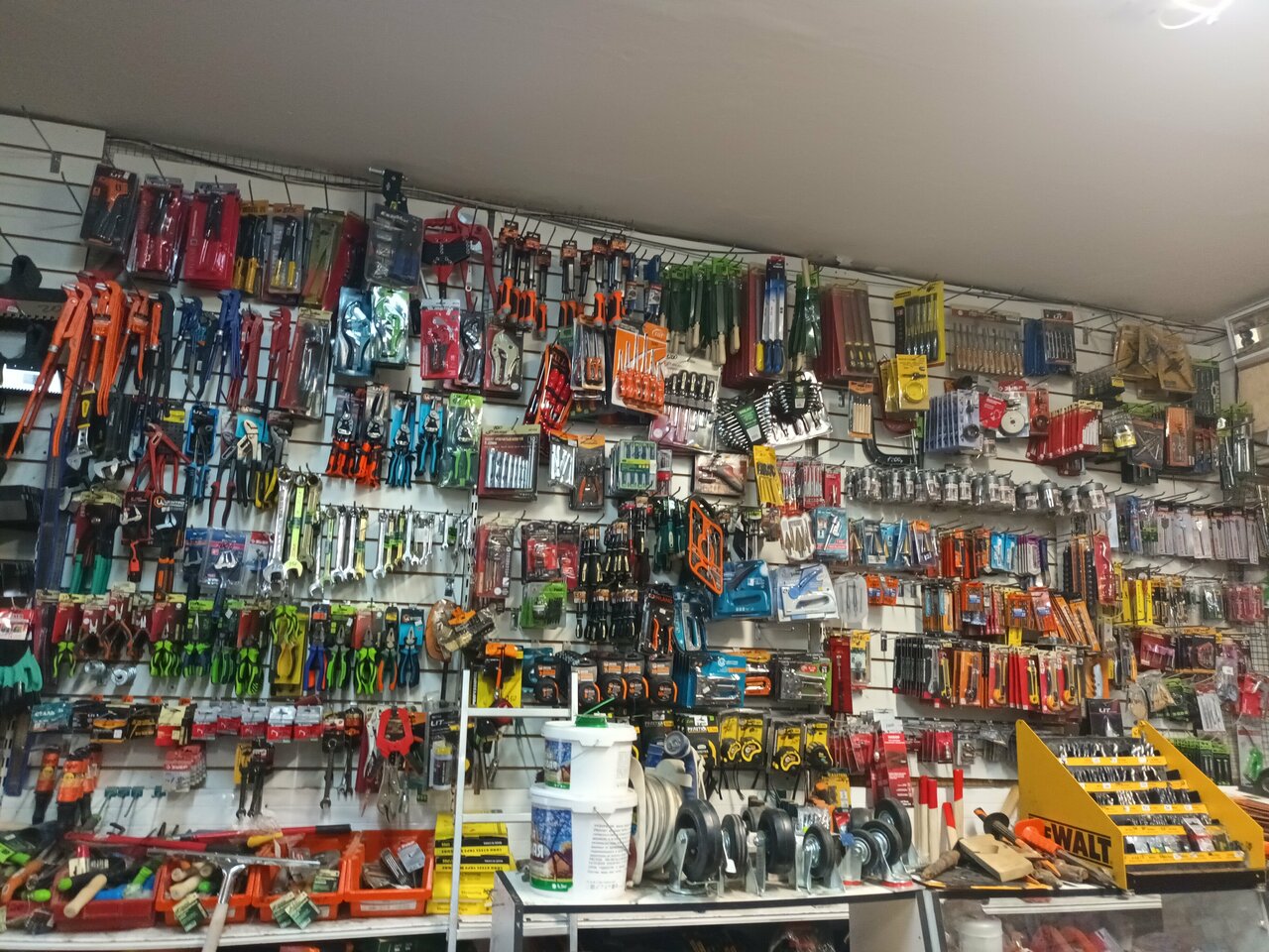 Практически все есть. Электроинструменты, ручной инструмент, и электрика, и водоснабжение, и краски с лаками, и крепежный материал.