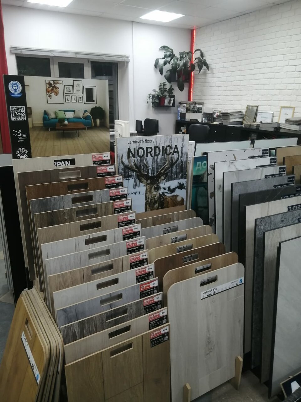 - Большой ассортимент напольных покрытий (линолеум, ламинат, кварцвиниловая плитка, керамогранит)