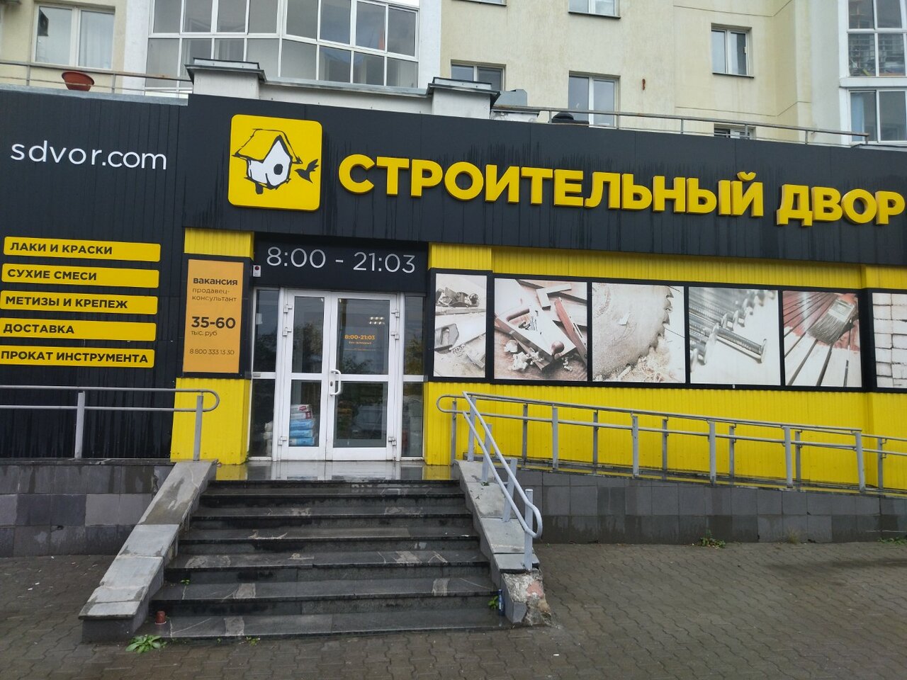 Строительный двор — магазин в Екатеринбурге (ул. Комсомольская, 76), предлагающий широкий ассортимент стройматериалов, включая природный камень, люки, стеновые панели и газобетон. Работает ежедневно с 08:00 до 21:03. Контакты: сайт (http://sdvor.com/), телефон 8 (800) 333-55-77.