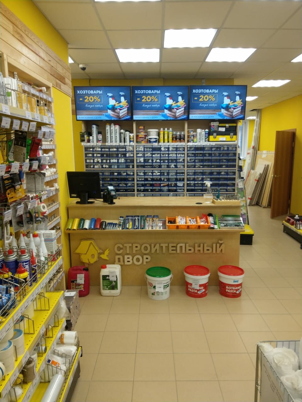 Магазинчик на случай ‘вдруг что-то понадобится’. Площадь не позволяет иметь большой ассортимент. Если только расходники (шурупчики,смеси всякие и тд). Цены чуть выше,чем в гипермаркетах,но, когда срочно надо, купишь по любой цене рядом с домом. На это и расчет.