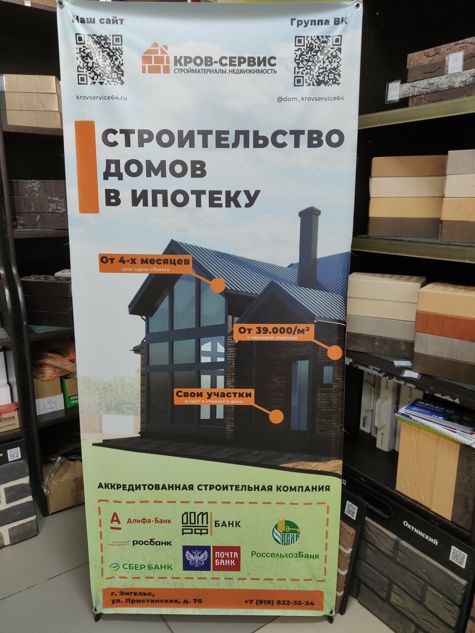 Кров-Сервис — строительный магазин в Энгельсе (Пристанская ул., 70), специализирующийся на продаже стройматериалов, включая газобетон, шлакоблоки и широкий ассортимент кирпича (строительный, силикатный, клинкерный, облицовочный и др.). Также предлагает услуги по строительству домов.