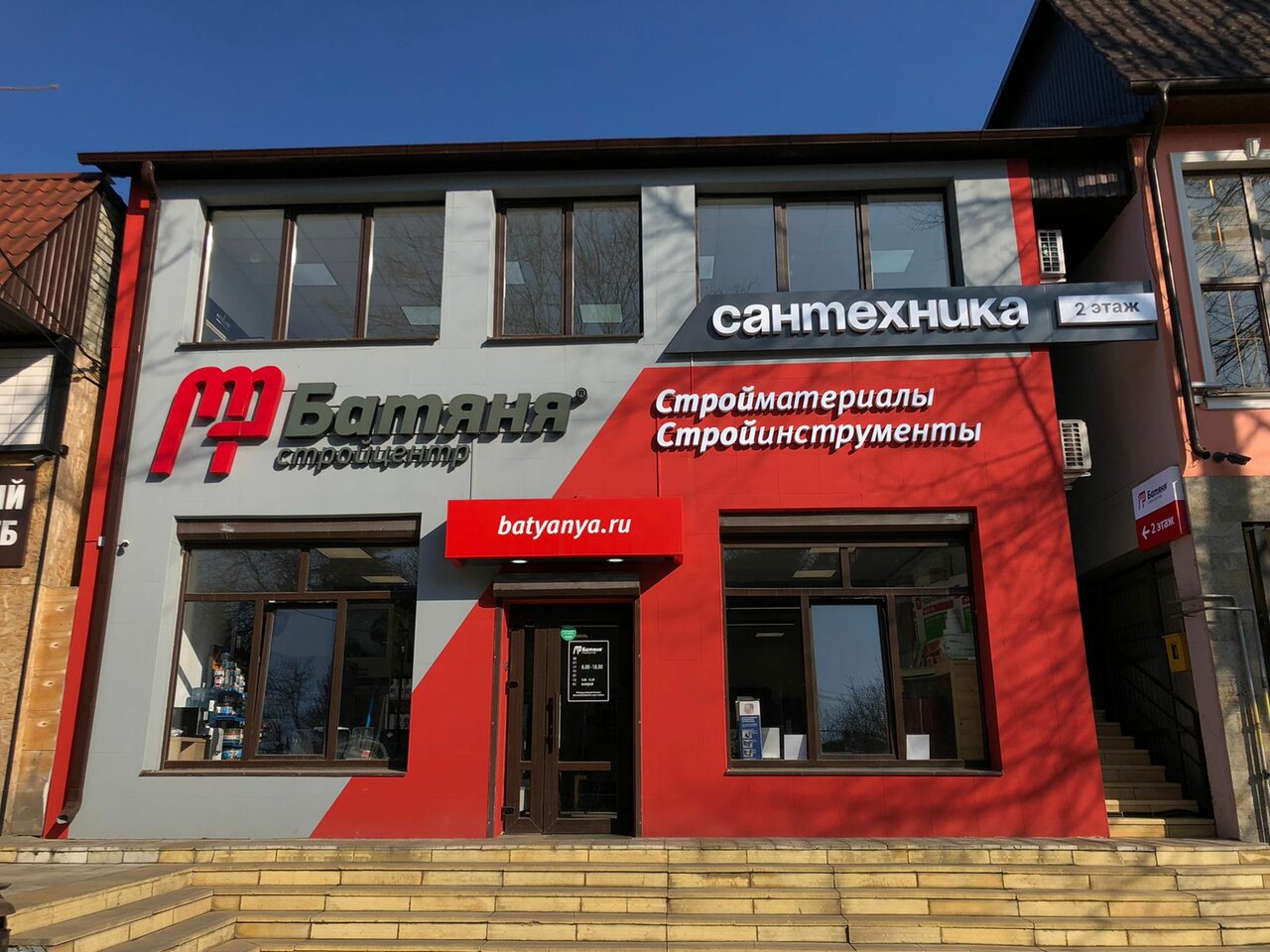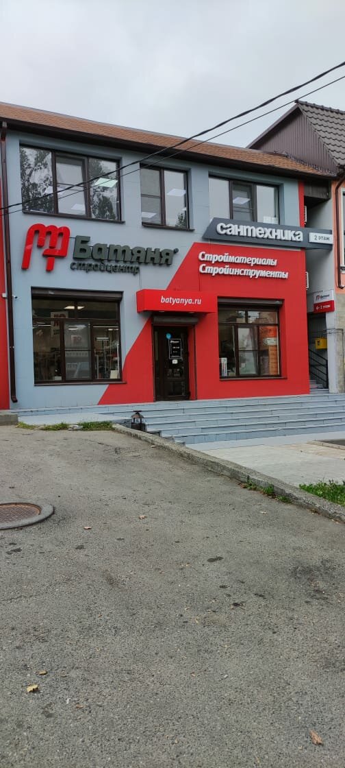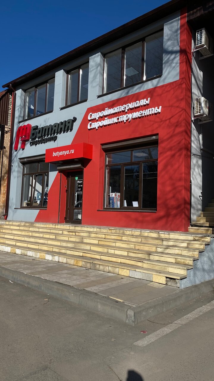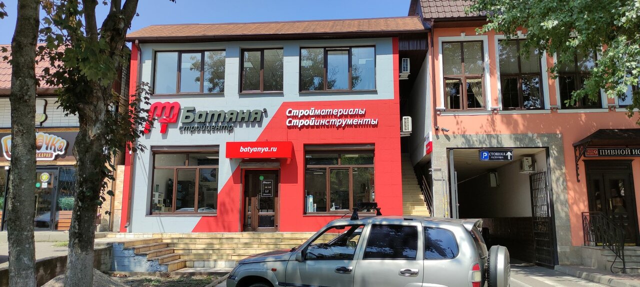 Батяня – строительный магазин в Ессентуках (Пятигорская ул., 129), предлагающий широкий ассортимент материалов, инструментов и товаров для ремонта. Специализируется на колеровке и режущем инструменте. Режим работы: пн-пт 08:00–18:00, сб-вс 09:00–15:00. Контакты: сайт (https://batyanya.ru/), телефоны +7 (909) 751-51-28 (Владислав), +7 (928) 816-09-25 (Кристина), +7 (928) 816-09-26 (Александр), 8 (800) 775-59-89.