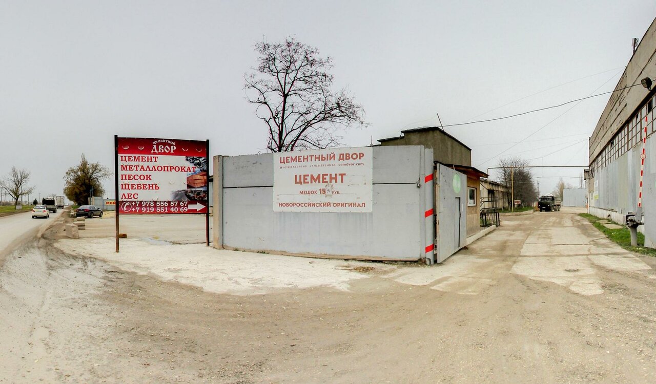 Цементный двор — строительный магазин в Евпатории, расположенный по адресу: ул. Виноградная, 5А. Специализируется на продаже стройматериалов, включая бетон, газобетон, ПГС, щебень, песок, отсев, гальку, природный камень, а также бетонные изделия и люки. Режим работы: пн-пт 08:00–17:00. Контакты: +7 (978) 556-57-67, +7 (978) 117-18-19.