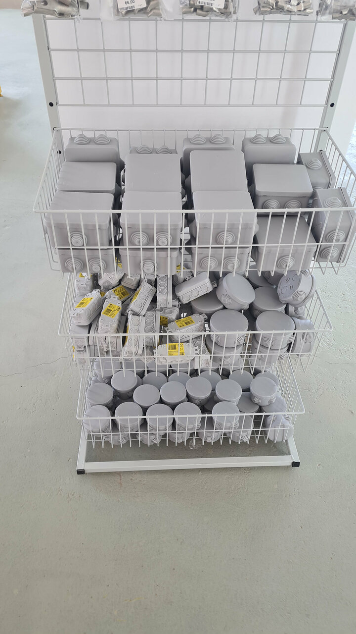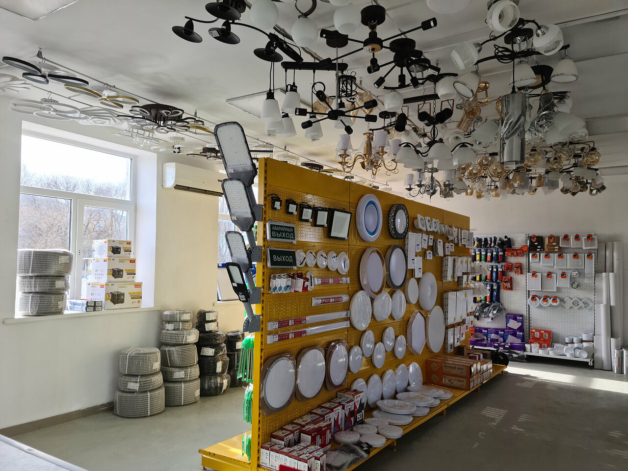 - Широкий ассортимент электрических комплектующих на втором этаже.