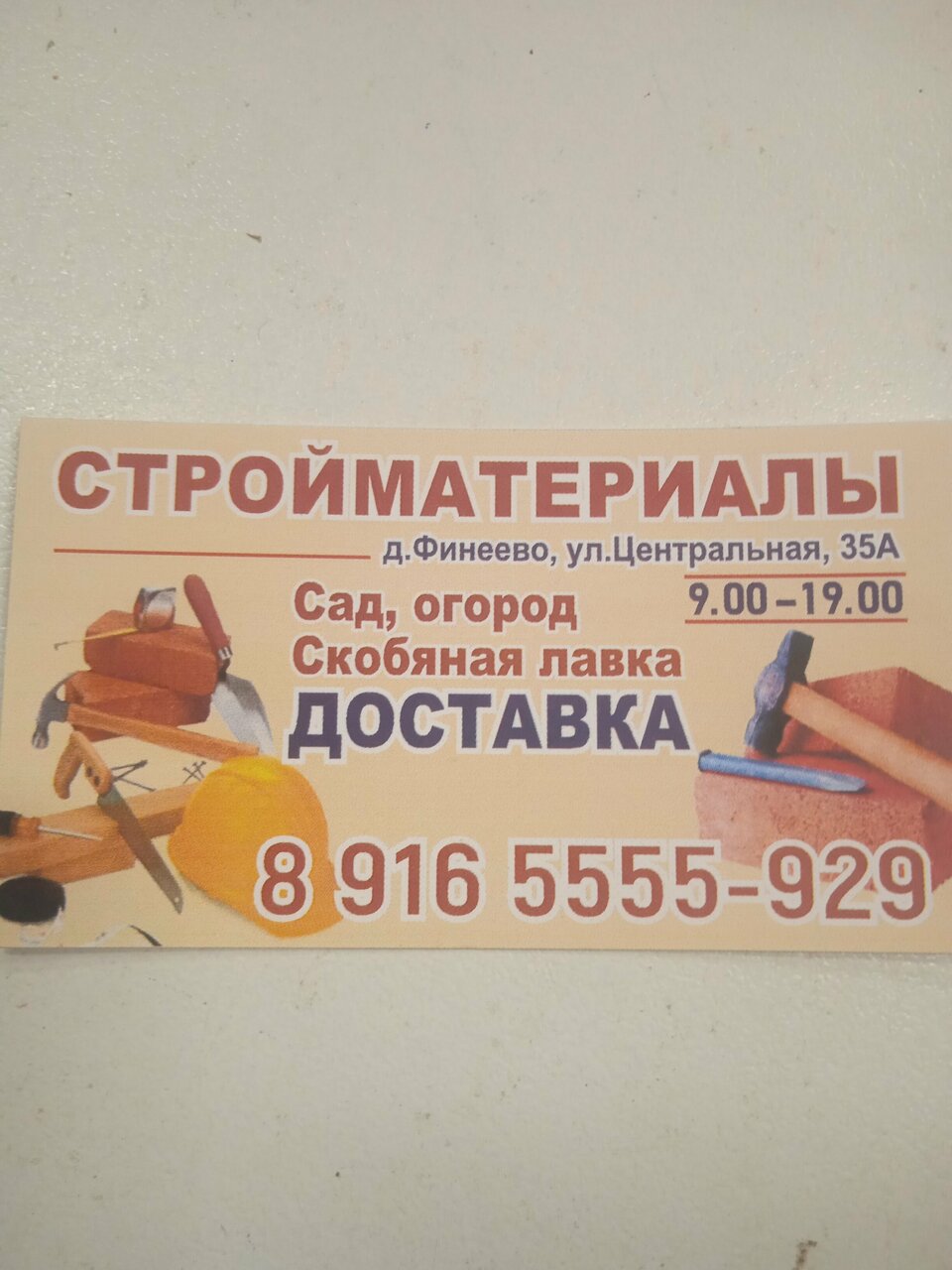 Скобяная лавка — строительный магазин в Финеево, расположенный по адресу Центральная улица, 35А. Торговая точка предлагает широкий ассортимент материалов, инструментов и товаров для строительства, ремонта и отделки. Работает ежедневно с 09:00 до 19:00. Контактный телефон: +7 (916) 555-59-29.