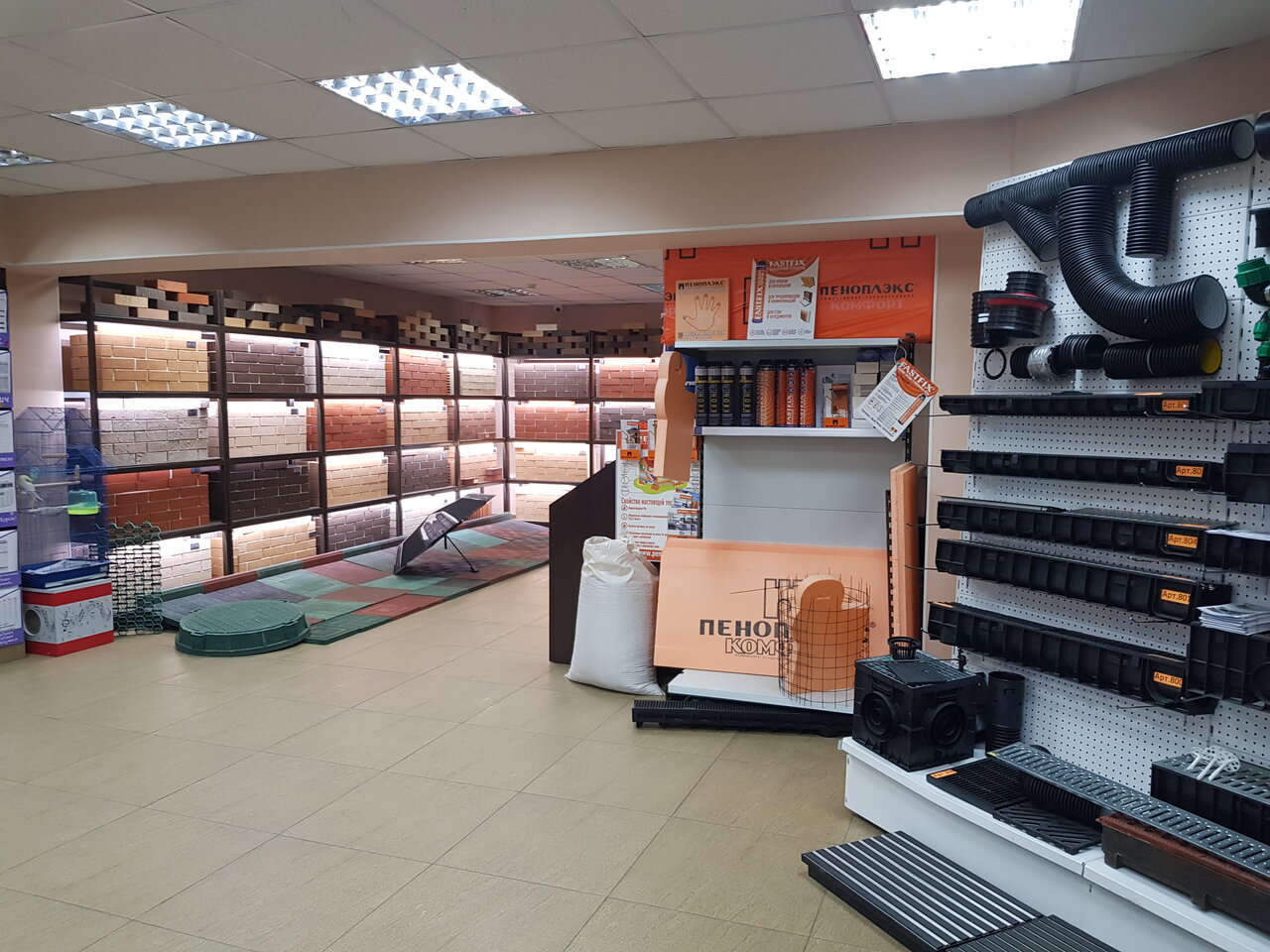 - Удобная парковка; Огромный ассортимент; Большой выбор кирпича и утеплителя; Адекватные цены; Гибкая система бонусов и оплаты
