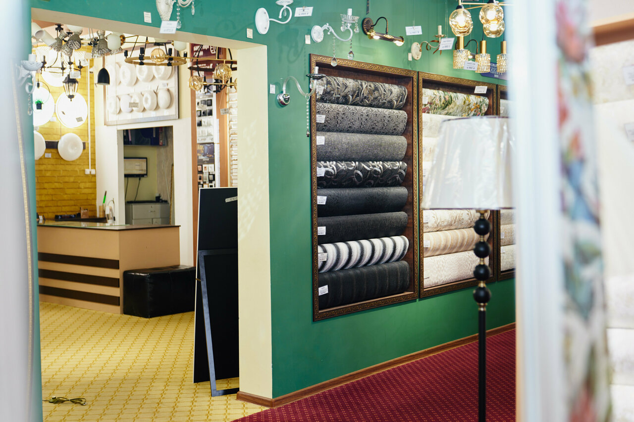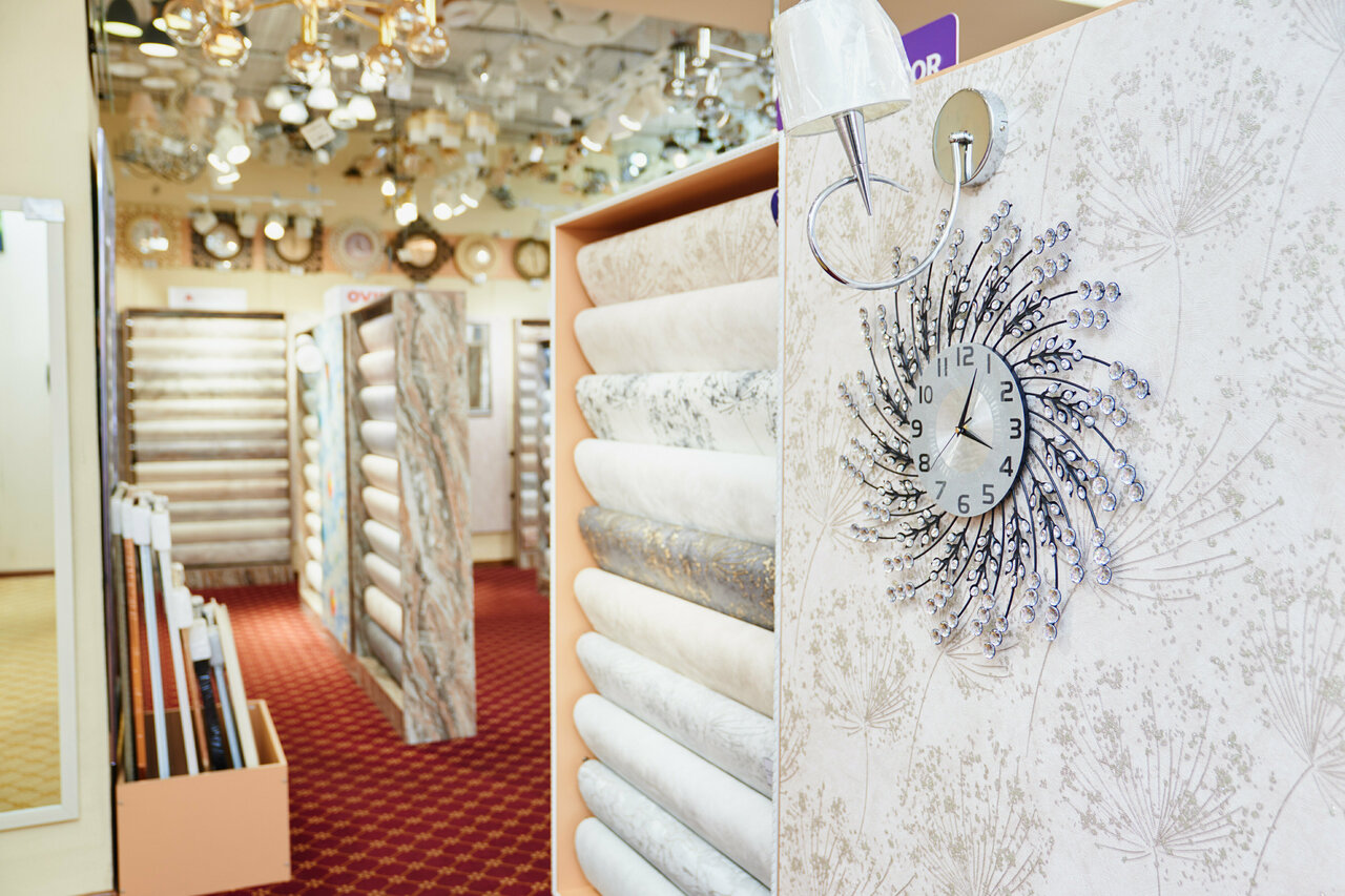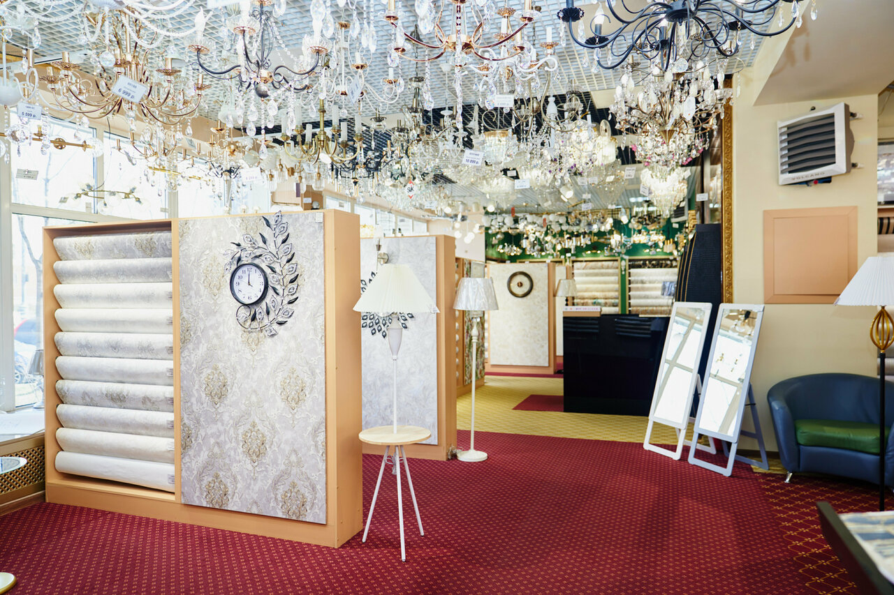 - Большой ассортимент (обои, люстры, светильники, зеркала, шторы)