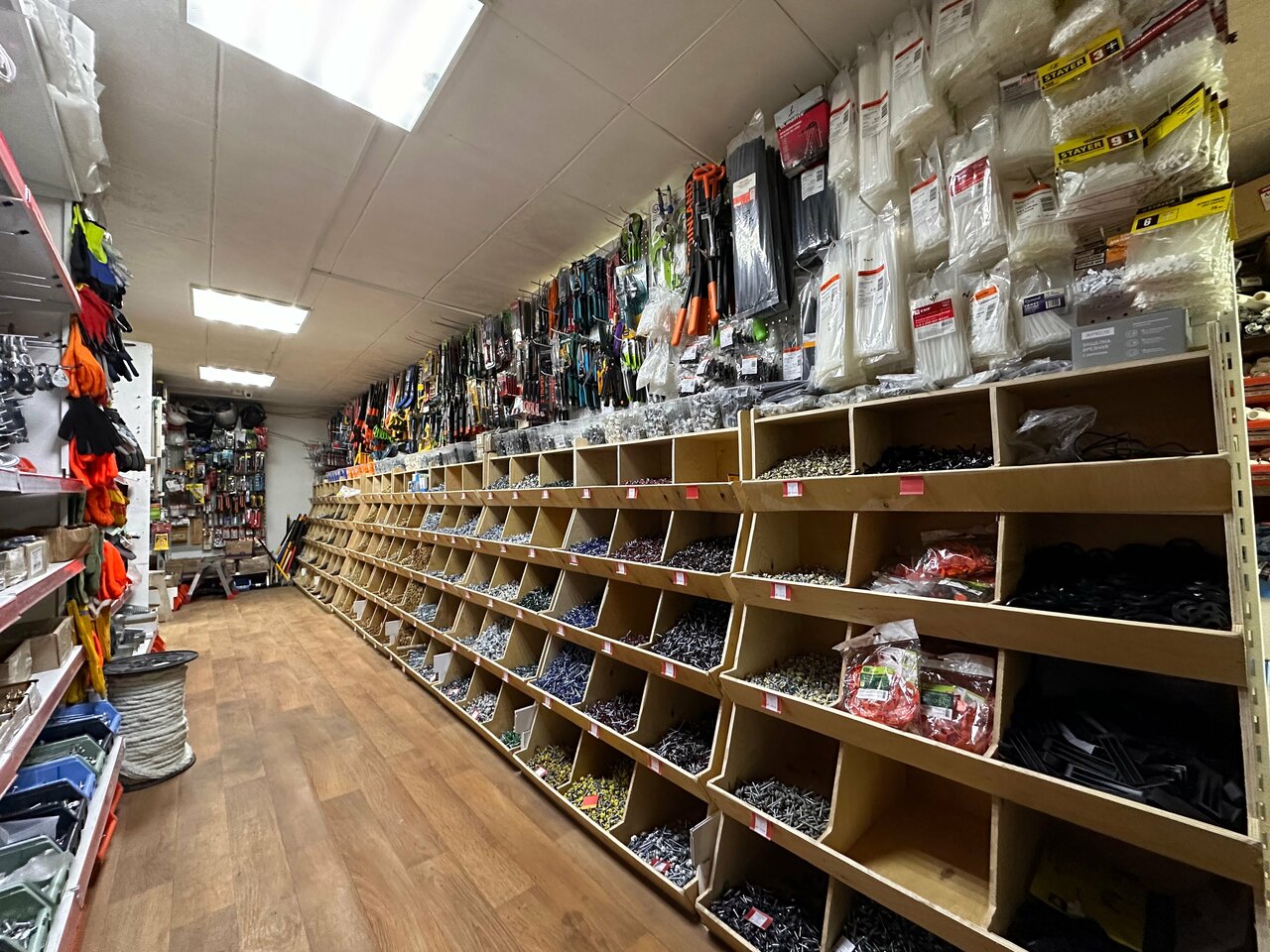 Магазин строительный, небольшой. Но в нем кажется все есть. Помещение использовано по максимуму. Могут и сделать заказ если не хватило материала. Продовцы всегда общаются хорошо, советуют.