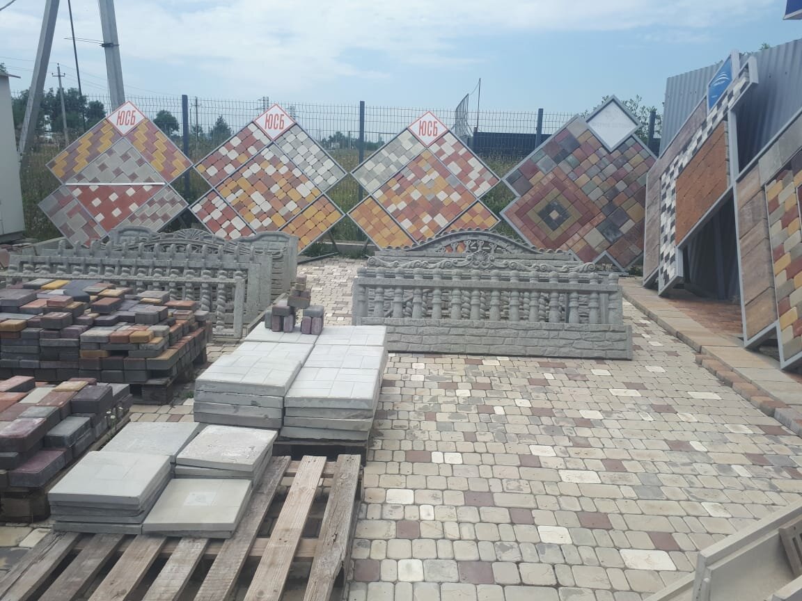 Продажа бетонных колец, тротуарной плитки разных производителей. Из плюсов: большой ассортимент, бюджетные цены. Из минусов: продавцы не спешат к потенциальным покупателям.
