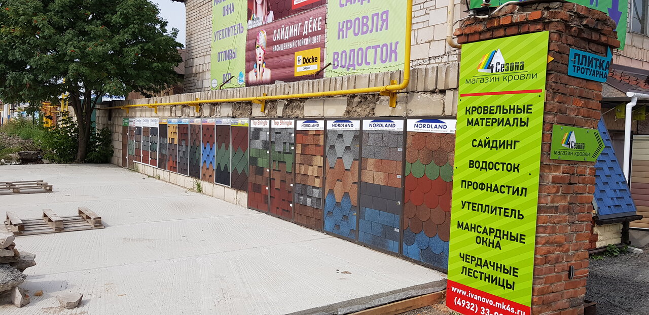 Строительный магазин «4 Сезона» в Иваново (ул. Суздальская, 2/58) предлагает широкий ассортимент кровельных и отделочных материалов. В продаже — фальцевая, сланцевая, битумная и металлочерепица, профнастил, шифер, мягкая рулонная кровля, люки и стеновые панели. Режим работы: пн-пт 09:00–18:00, сб 09:00–15:00. Контакты: +7 (4932) 33-92-16, +7 (920) 671-57-72, +7 (4932) 33-87-88.