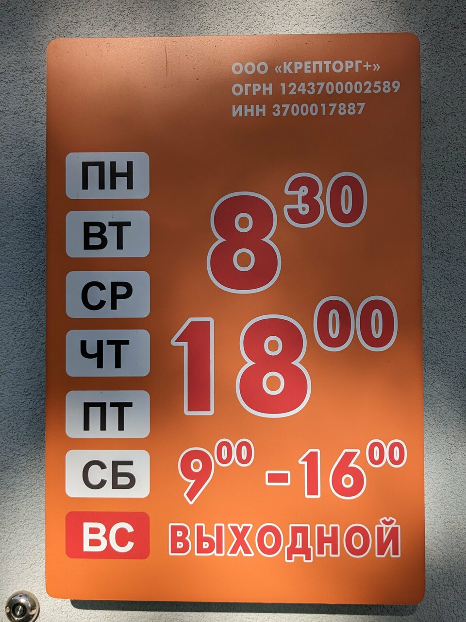 КрепТорг — строительный магазин в Иваново, расположенный по адресу: Велижская улица, 70. Ассортимент включает материалы, инструменты и товары для строительства, ремонта и отделки. Режим работы: пн-пт 08:30–18:00, сб 09:00–16:00. Контакты: телефоны +7 (4932) 34-45-95, +7 (4932) 23-65-11, +7 (4932) 42-96-41, +7 (964) 495-90-00, +7 (905) 109-45-95. Подробнее на сайте: (https://krep37.ru/).