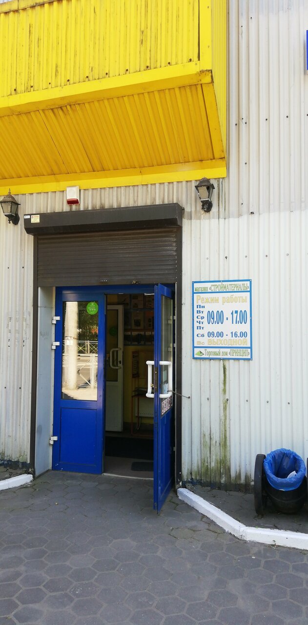 «Принцип» — строительный магазин в Калининграде, расположенный по адресу: проспект Победы, 139А. Торговая точка предлагает широкий ассортимент материалов, инструментов и сопутствующих товаров для строительства, ремонта и отделки. Режим работы: пн-пт 09:00–17:00, сб 09:00–16:00. Контакты: +7 (4012) 96-00-90, +7 (4012) 93-33-40. Подробнее на сайте: (http://princip39.ru/).