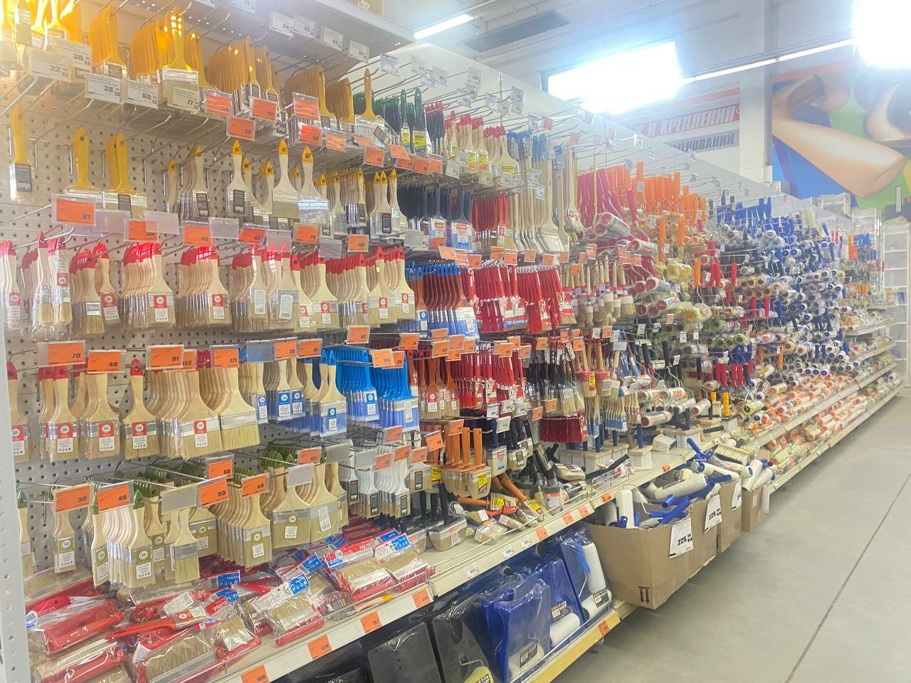 Качество товара не очень(краска). Плохое пополнение товара, полки полупустые. Плохо висят обои-не видно ценников, что бы узнать цену, надо поднять рулон и поискать ценник. Неизвестность цены отталкивает от покупки.