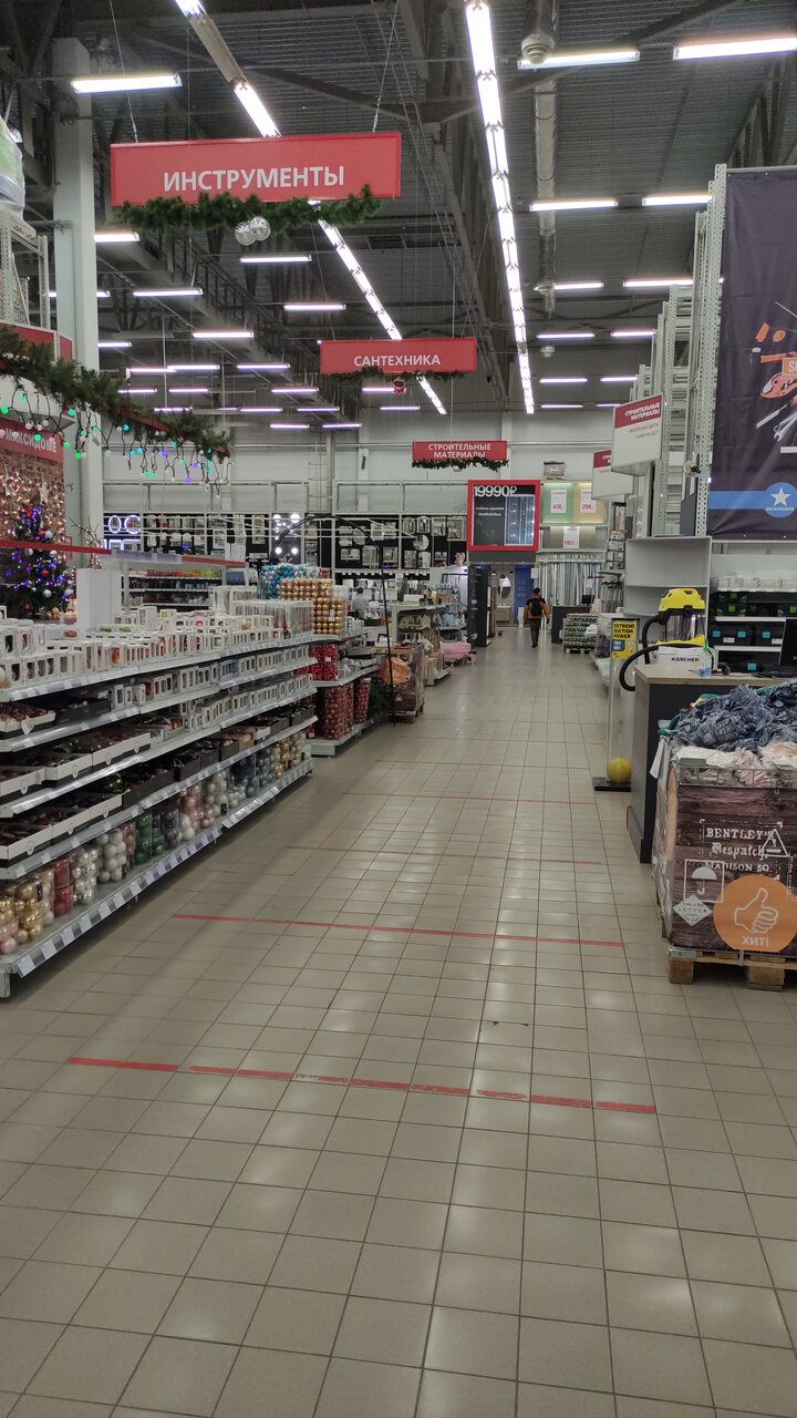Большой ассортимент для ремонта. Так же нравится посуда. Много рабочих касс,система скидок. Парковка+ приду ещё