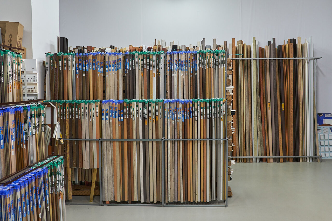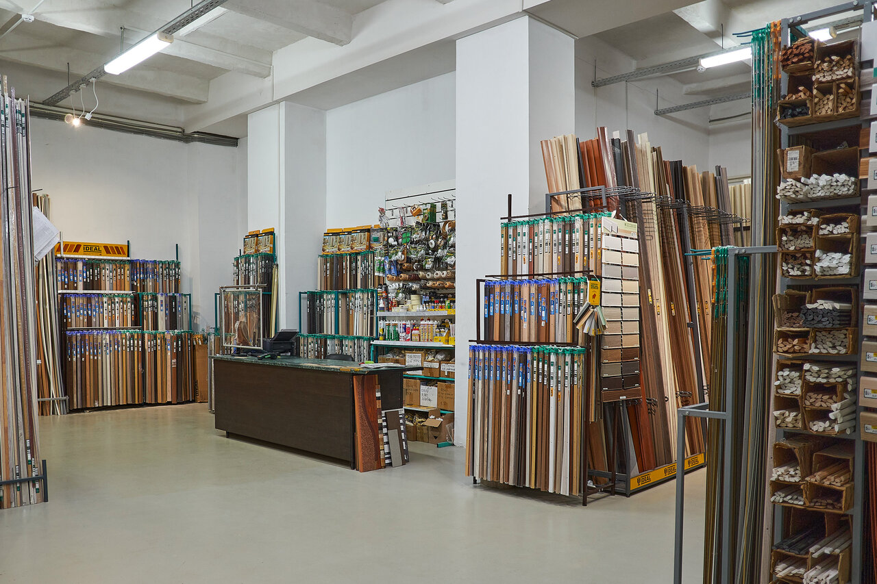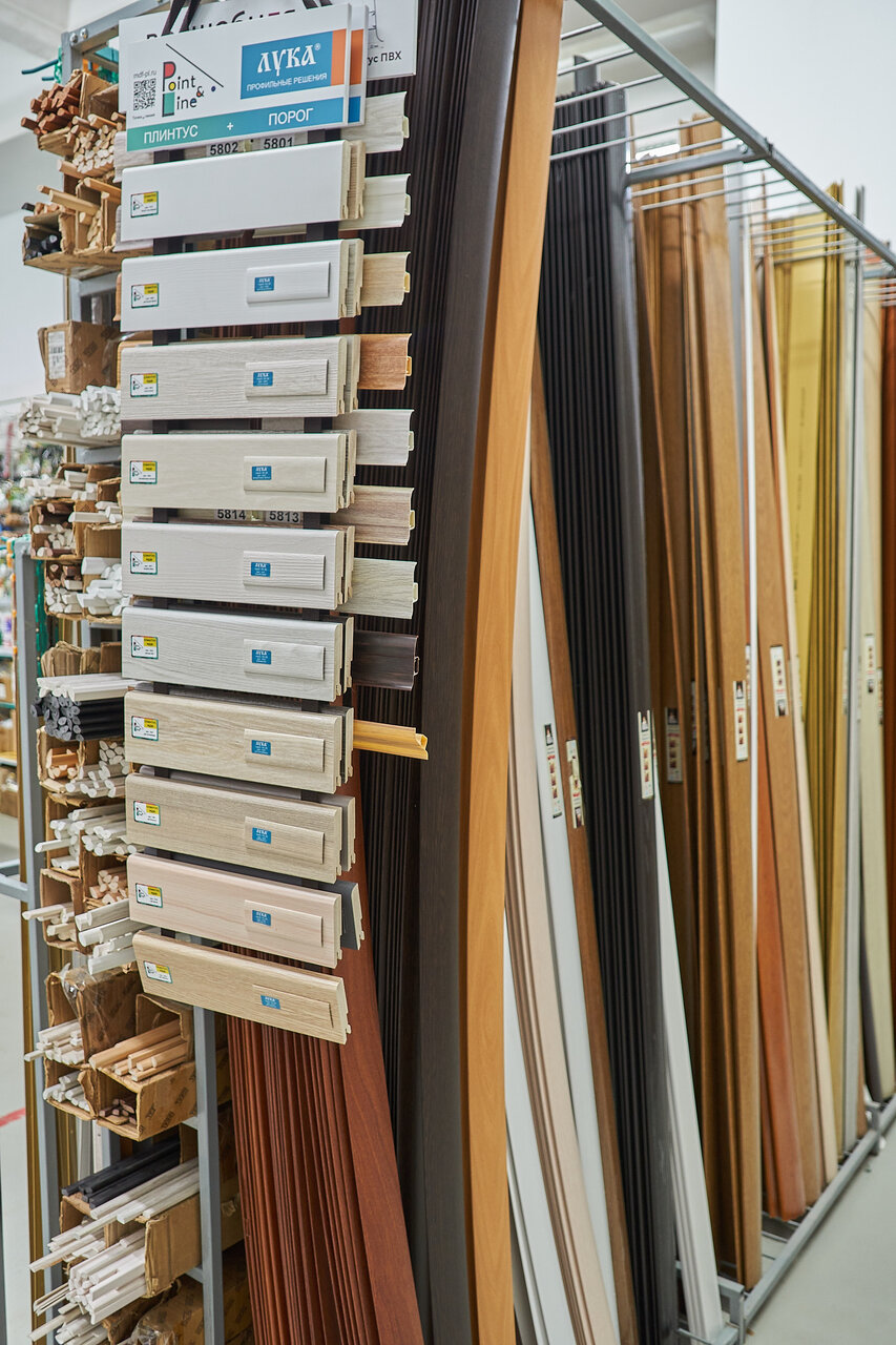 Большой выбор уголков, порогов, плинтусов — как обычных, так и широких. Приятные цены. Есть вещи, которые тяжело найти, например, обводы на трубы, т-пороги и металлические профили.