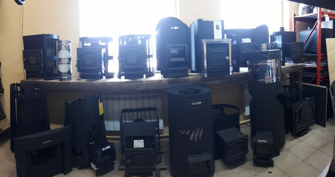 - Хороший выбор печей и каминов