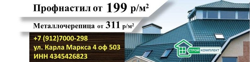 Стройкомплект — строительный магазин в Кирове, предлагающий широкий ассортимент материалов для кровли: черепицу, профнастил и металлочерепицу. Расположен по адресу: ул. Карла Маркса, 4/2. Режим работы: пн-пт 09:00–18:00. Контакты: +7 (912) 700-09-59, +7 (8332) 26-61-10, +7 (912) 700-02-93. Подробнее на сайте: (https://стройкомплект43.рф/).