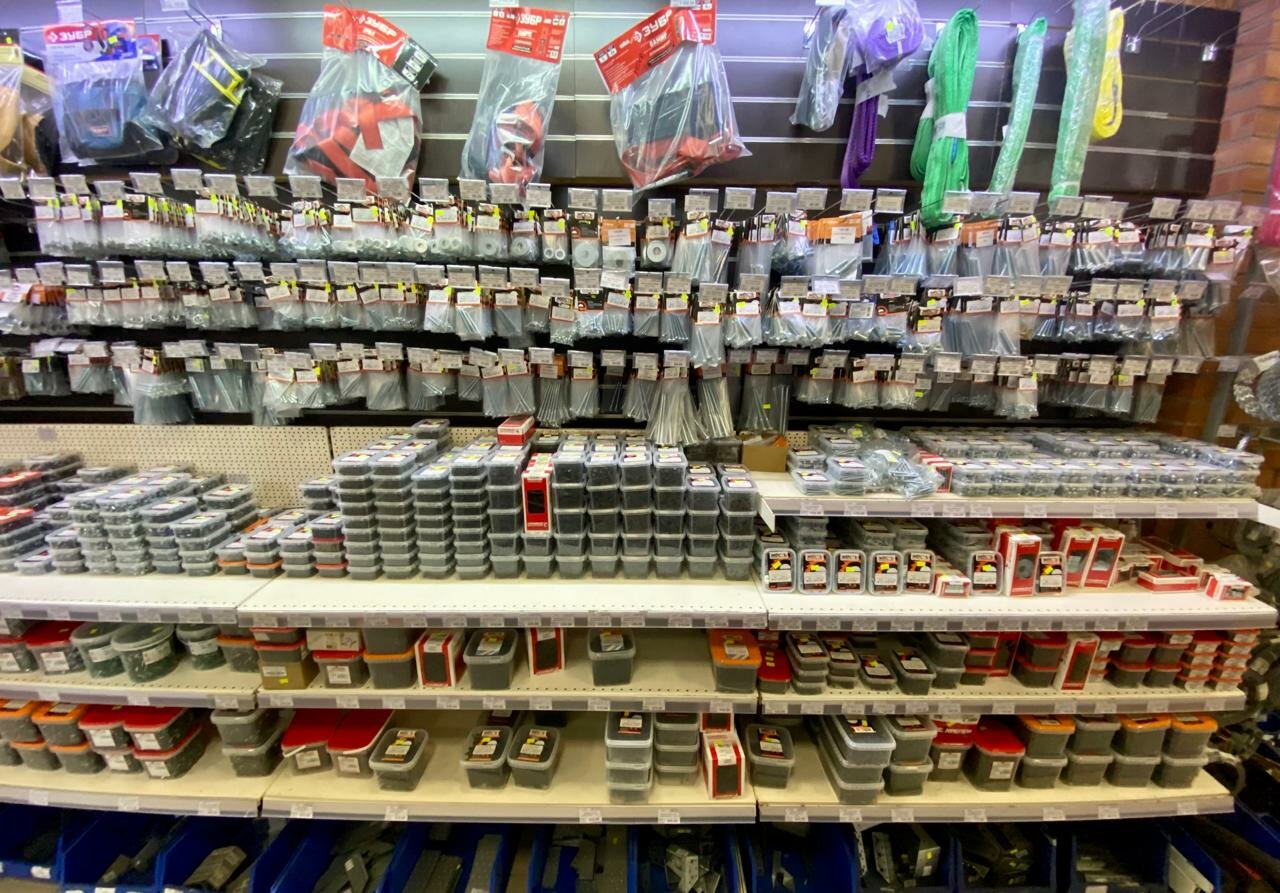 Хороший ассортимент, единственное место, где удалось найти мебельные шканты в мелкой фасовке.
