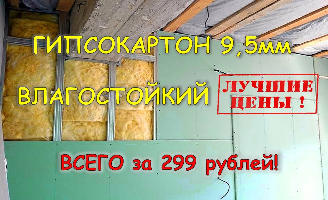 - Гипсокартон в/с 9,5мм 2,5х1,2м 460₽