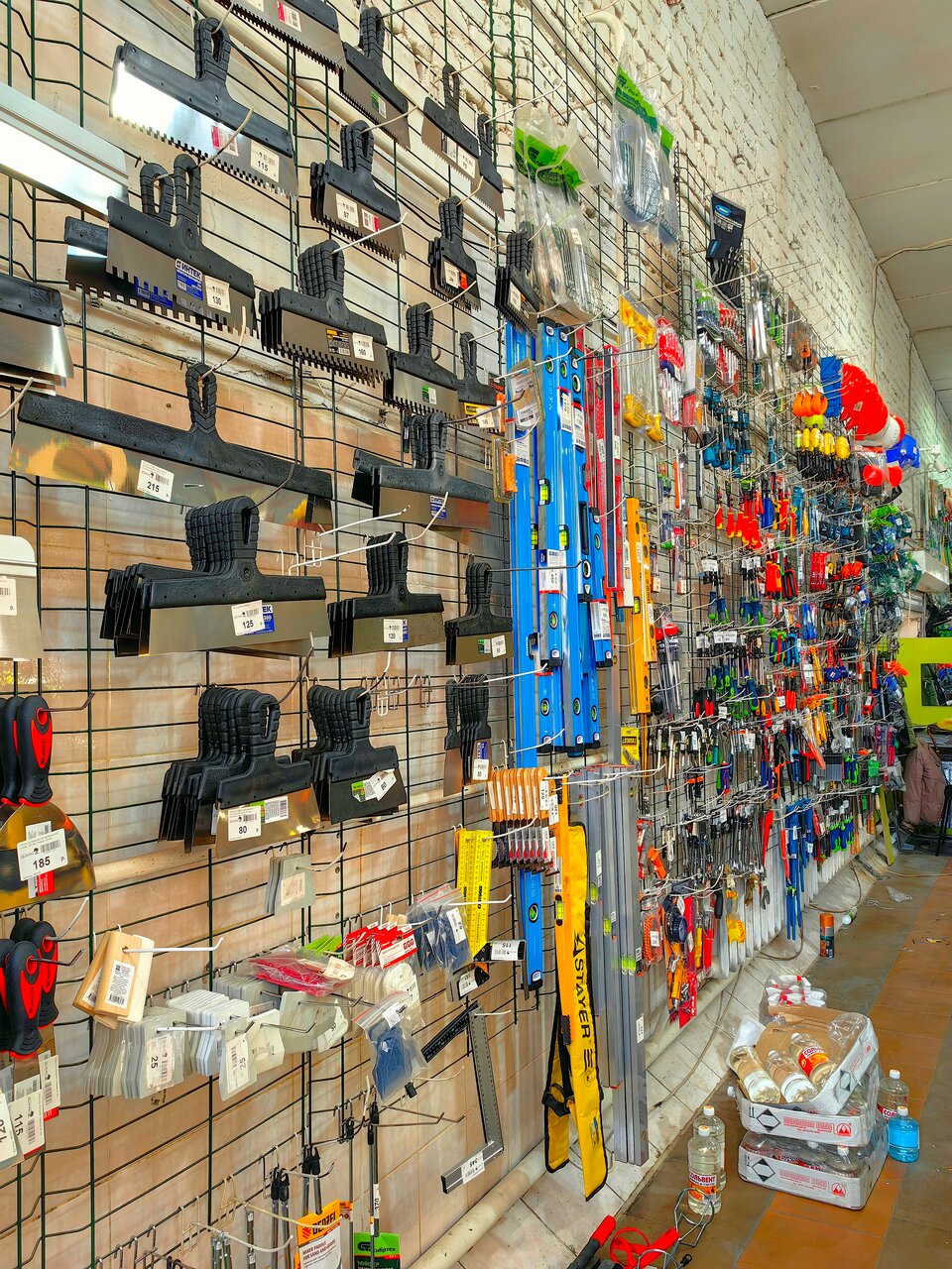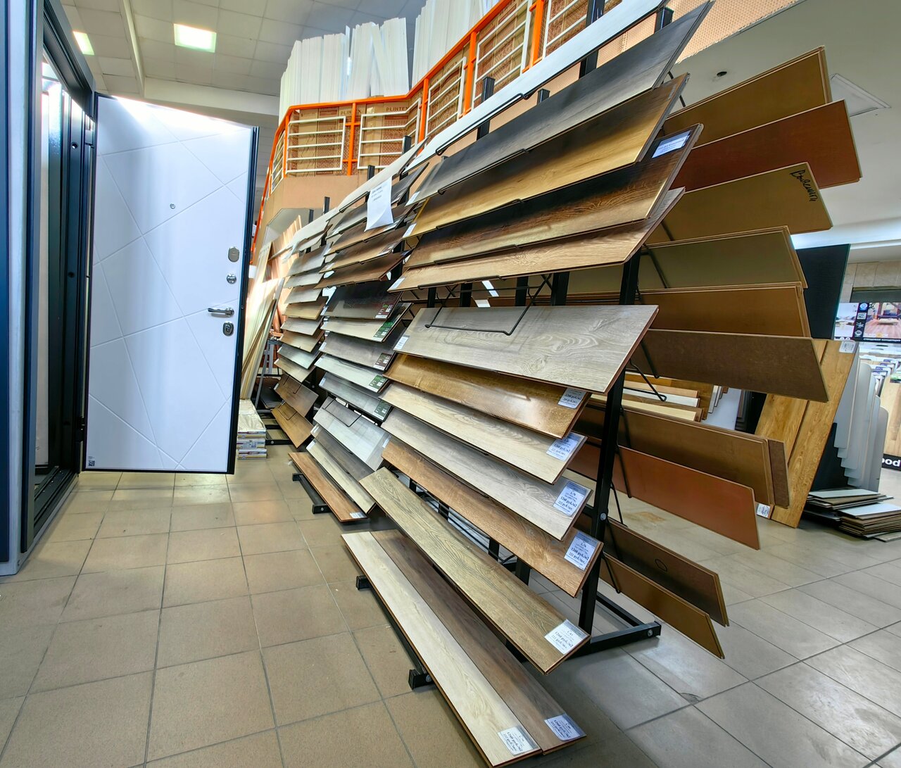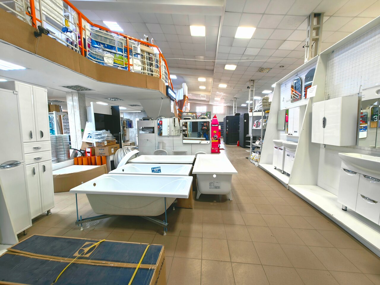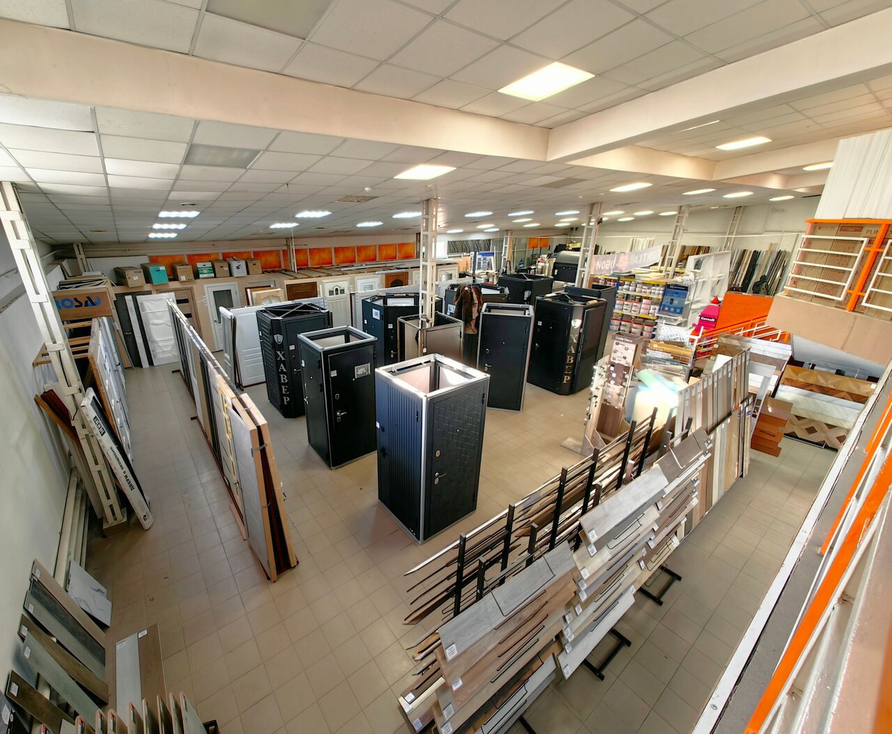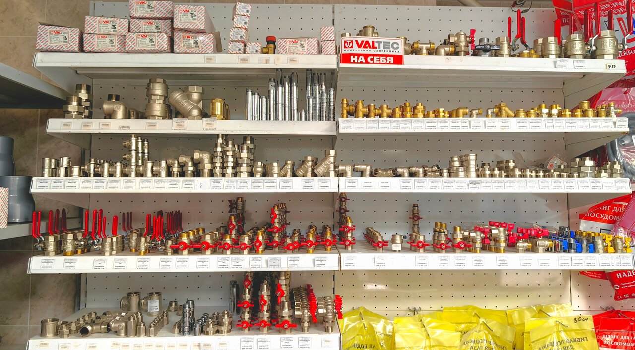 Очень большой ассортимент кафельной плитки, ламината, межкомнатных и наружных дверей, а также крепёж, инструменты, электроника. В отделе сантехники есть в продаже канализационные и водопроводные трубы, мебель для ванной комнаты, душевые ограждения, смесителя.