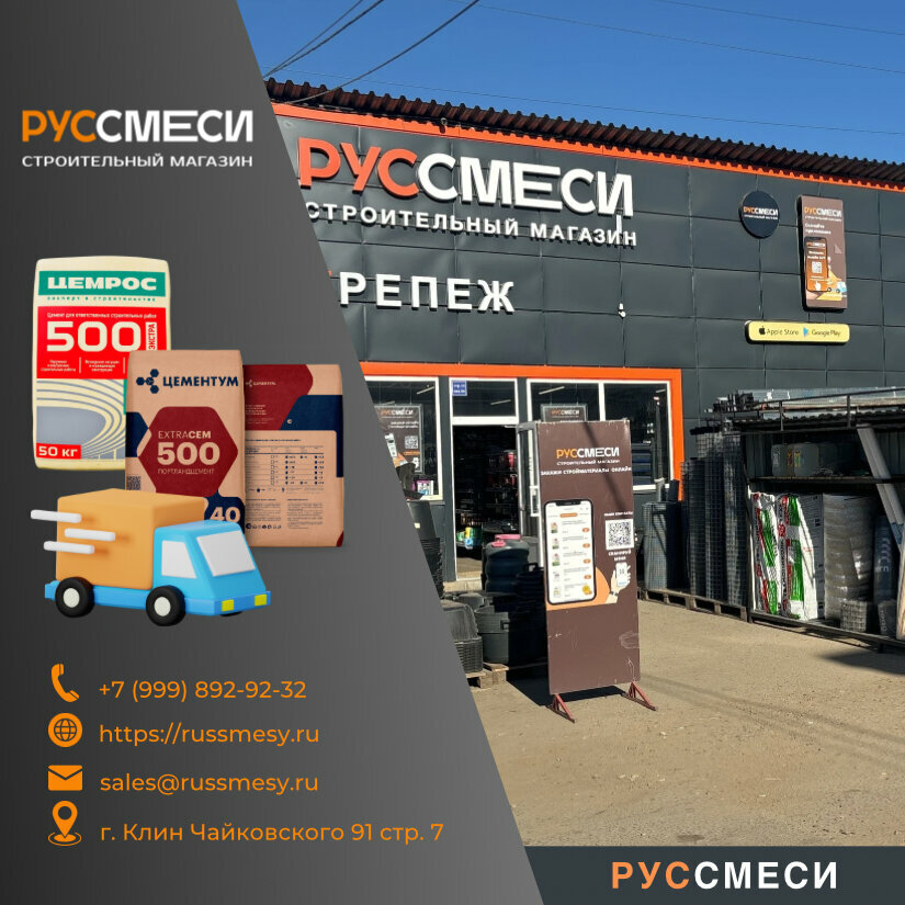 Руссмеси — строительный магазин в Клину, расположенный по адресу: ул. Чайковского, 91. Ассортимент включает материалы, инструменты и товары для строительства, ремонта и отделки. Магазин работает ежедневно с 08:30 до 19:00. Контакты: +7 (495) 108-58-69, +7 (999) 892-92-32. Подробнее на сайте: (https://russmesy.ru/).