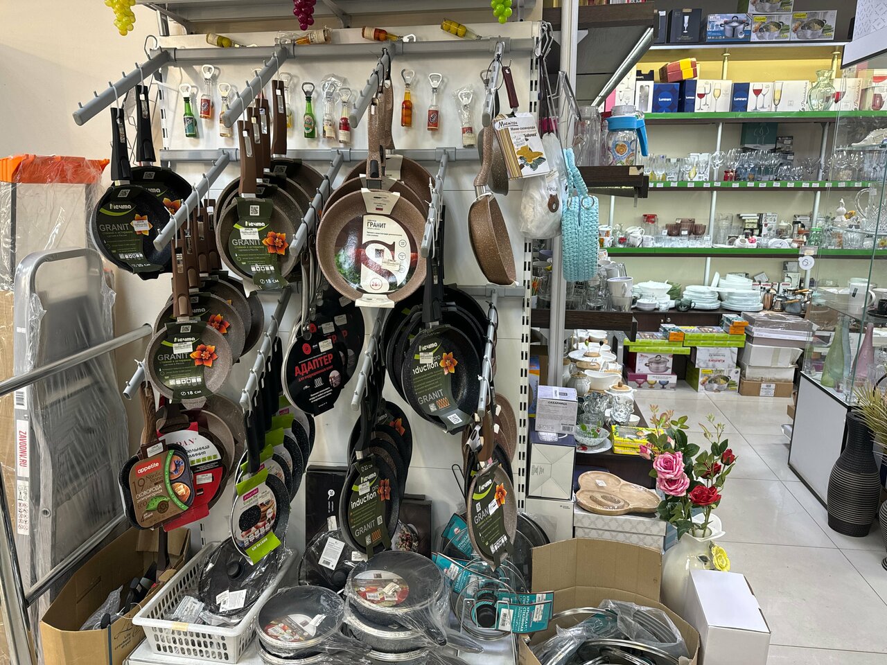 Всегда большой ассортимент — посуда для приготовления и сервировки , что-то для мелкого ремонта , для уборки , гигиены , для цветов и ещё какие-то мелочи