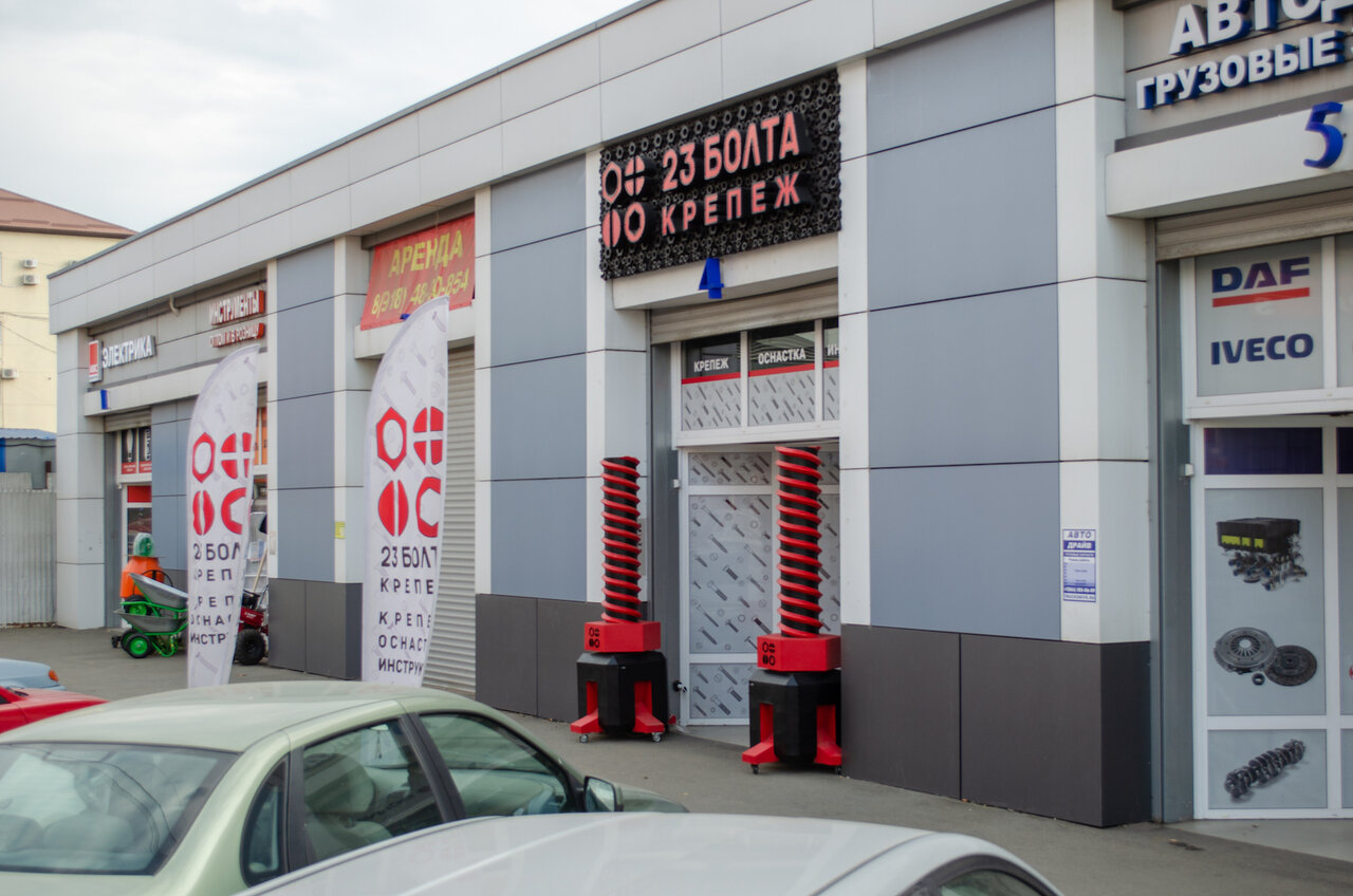 23 Болта — строительный магазин в Краснодаре, расположенный по адресу: ул. Уральская, 126/4. Специализируется на продаже режущего инструмента для строительства и ремонта. Режим работы: пн-пт с 09:00 до 18:00. Контакты: +7 (918) 348-23-23, сайт: (https://www.23bolta.ru/).