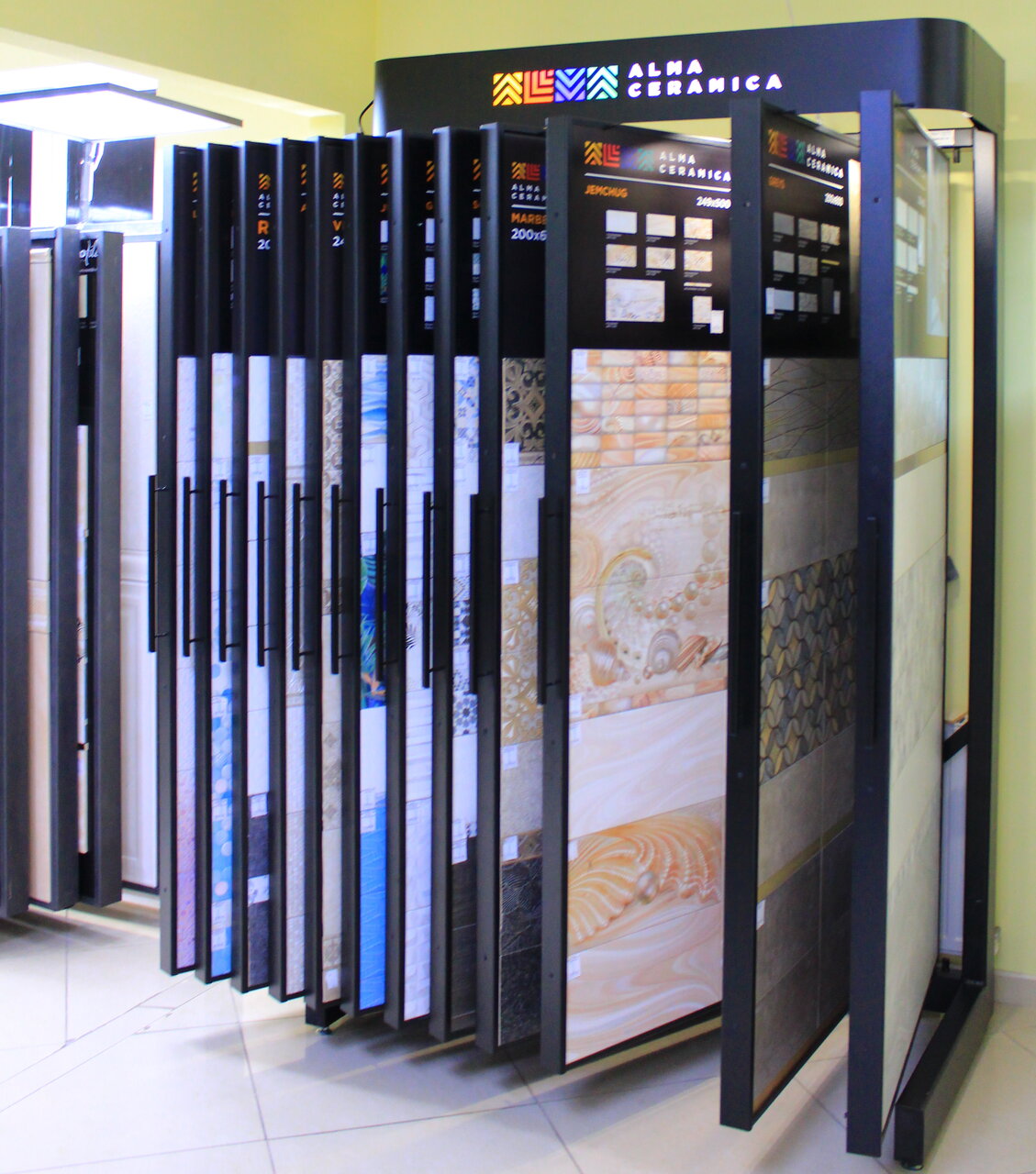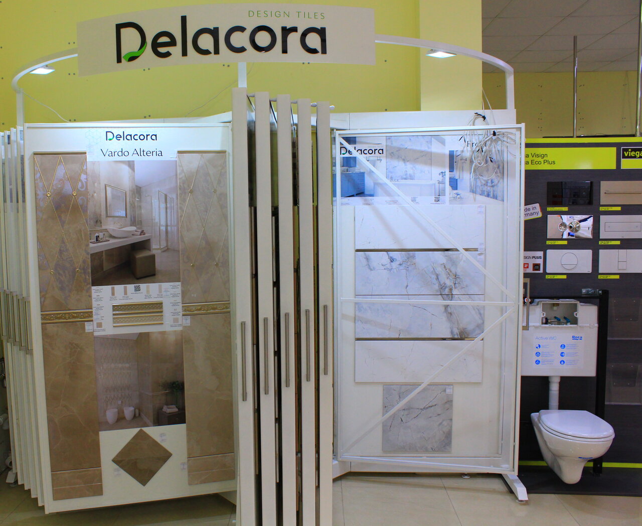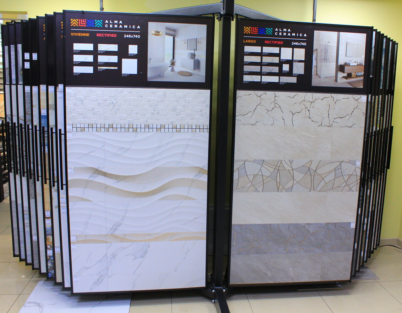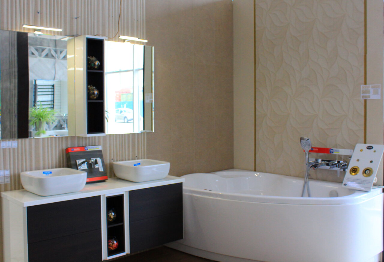 Большой выбор керамической плитки, любого размера, так же сопутствующие материалы, затирка плитки, зеркала, смесители, есть хорошие скидки на коллекции.