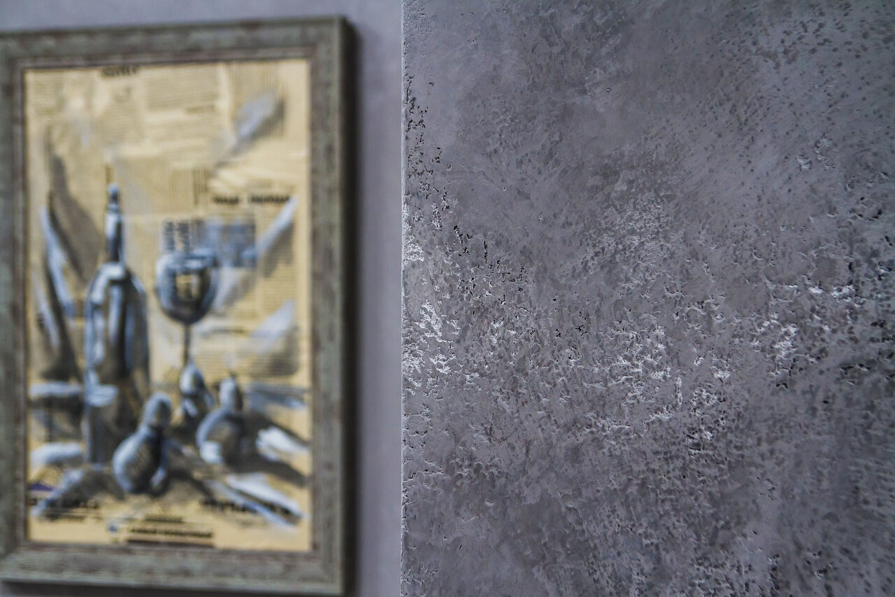 Декоративная готовая цветная штукатурка с бетонной текстурой на основе акриловой эмульсии для внутренних и наружных работ, наносимая мастерком, при помощи которого и придаётся текстура.