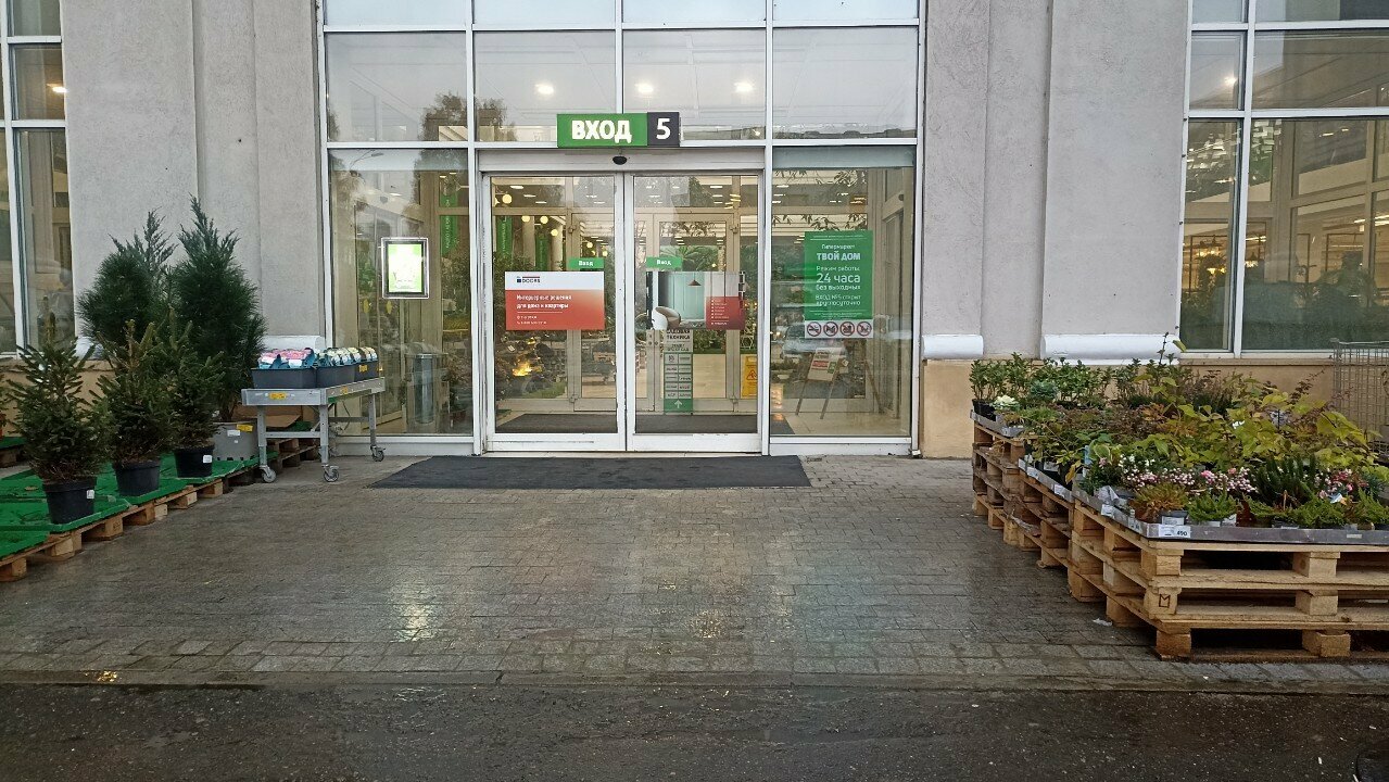 - Чистота и мало покупателей (комфортная атмосфера); Отдельный павильон-оранжерея; Большой ассортимент товаров (от ручки до крупной мебели); Бесплатная парковка; Вежливые и ненавязчивые консультанты