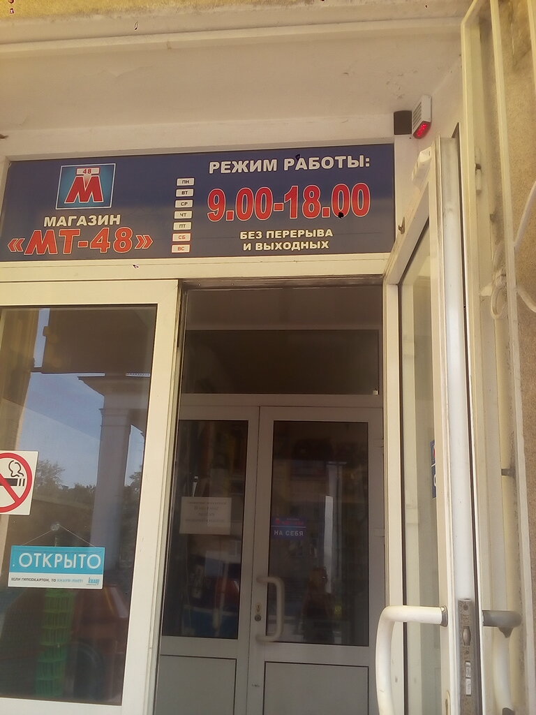 Мт-48 — строительный магазин в Липецке, расположенный по адресу: ул. Коммунистическая, 20А. Ассортимент включает материалы, инструменты и товары для строительства, ремонта и отделки. Работает ежедневно с 09:00 до 18:00. Контакты: телефон +7 (4742) 44-78-64, сайт (http://mt48.ru/).
