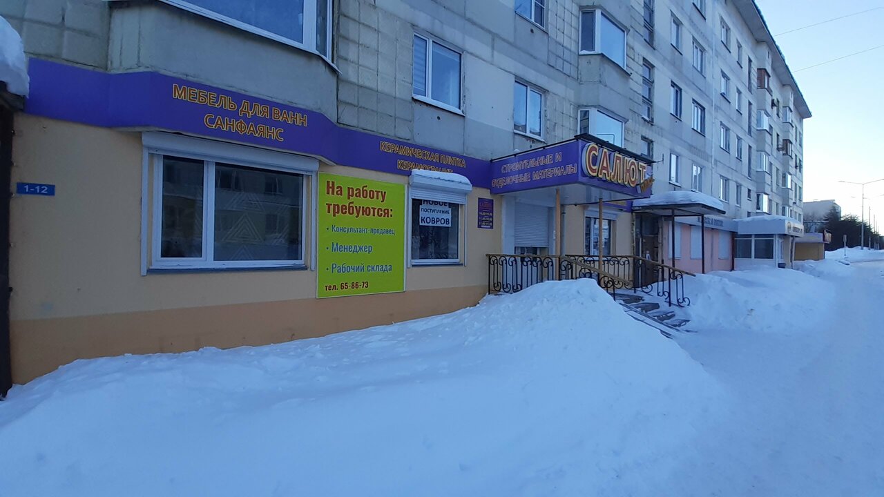 Строительный магазин «Салют» находится в Магадане по адресу: ул. Наровчатова, 21. Магазин предлагает широкий ассортимент строительных материалов, инструментов и товаров для ремонта. Режим работы: пн-пт 10:00–19:00 (перерыв 14:00–15:00), сб 11:00–18:00 (перерыв 14:00–15:00), вс 11:00–17:00 (перерыв 14:00–15:00). Контактный телефон: +7 (4132) 65-04-09.