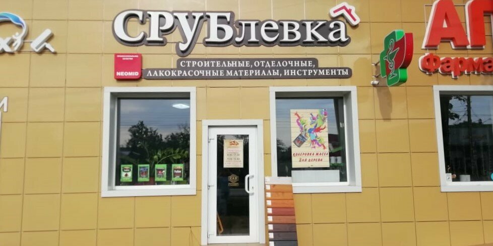 СРУБлёвка — строительный магазин в Майкопе, расположенный по адресу Западная улица, 29Б. Специализируется на продаже материалов для деревянного домостроения, лакокрасочных покрытий и сопутствующих товаров. Предлагает услугу колеровки. Режим работы: вт–сб 08:00–17:00, вс 09:00–15:00. Контакты: +7 (988) 242-72-50 (строительные материалы), +7 (861) 242-72-50 (лакокрасочные материалы). Подробнее на сайте: (https://srublevka.ru/).