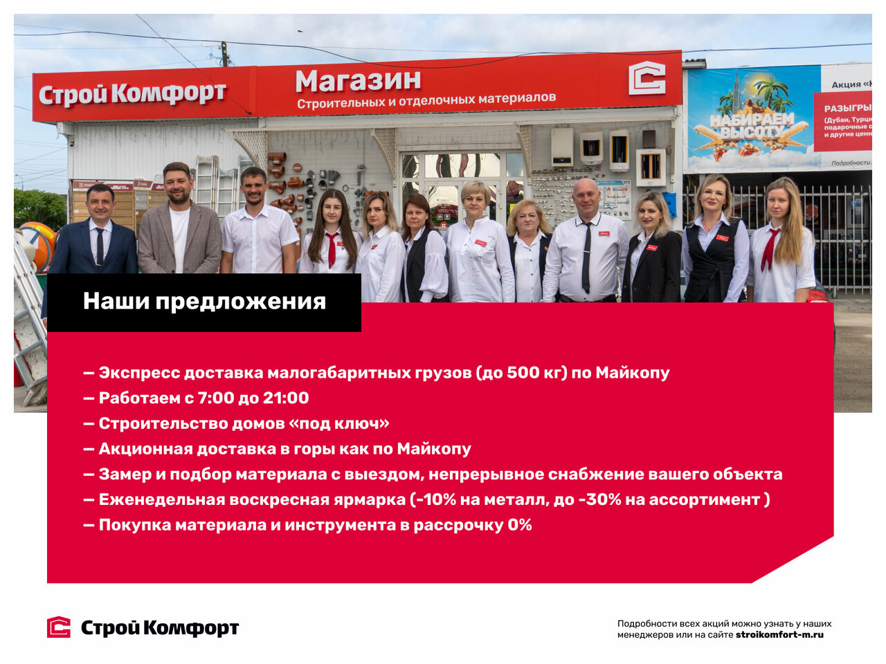 Великолепная строительная база Огромный ассортимент стройматериалов, внимательный и отзывчивый персонал, крутые воскресные акции. Принял участие в топовом розыгрыше Набираем высоту: приобрел арматуру, менеджер Богдан настоял на участии в акции. Закинул в барабан билетик и через пару месяцев звонок — Вы выиграли путевку на отдых номиналом 200 000 тысяч рублей! Вот так просто и легко удалось посетить Дубай! Спасибо Стройкомфорту за высший сервис и крутой розыгрыш!