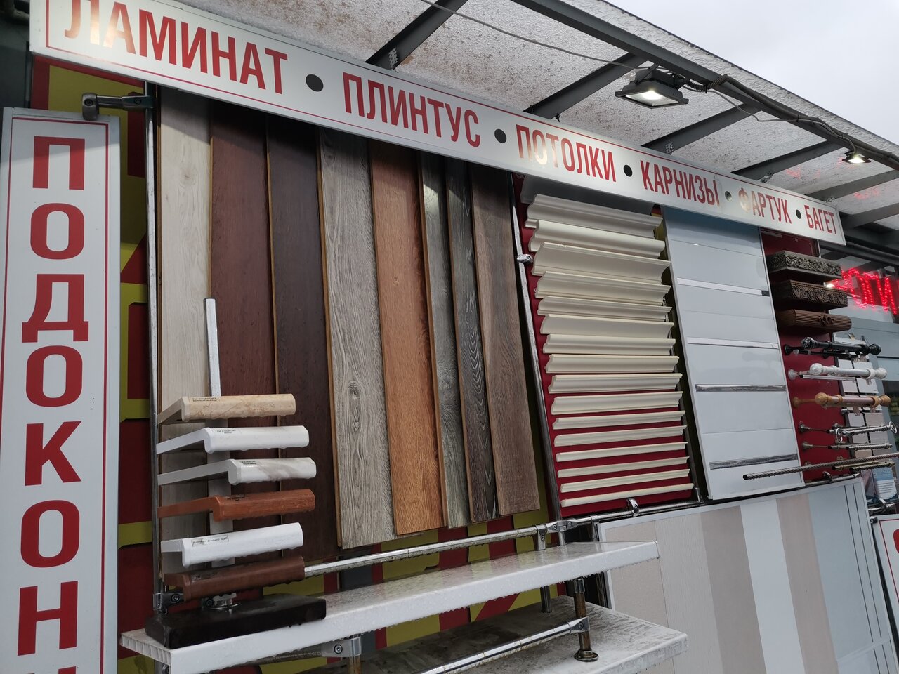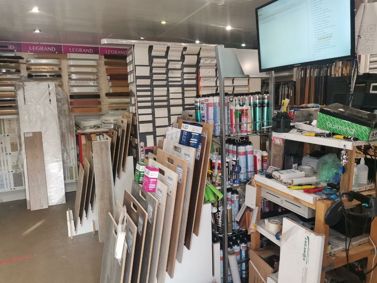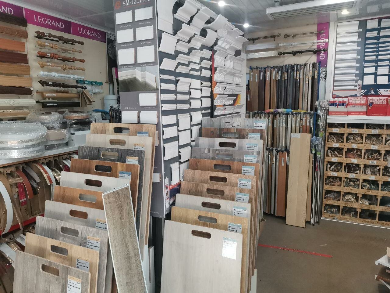 - Большой выбор товаров (ламинат, кварцевый винил, панели ПВХ, гардины и др.)