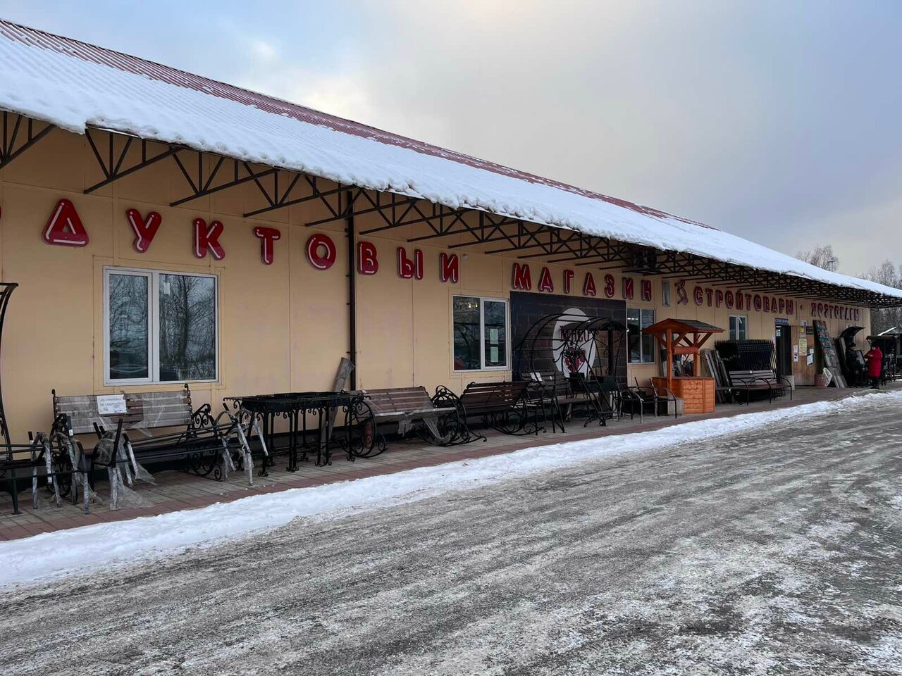 - Большой ассортимент товаров (стройматериалы, садовый декор, продукты, хозтовары)