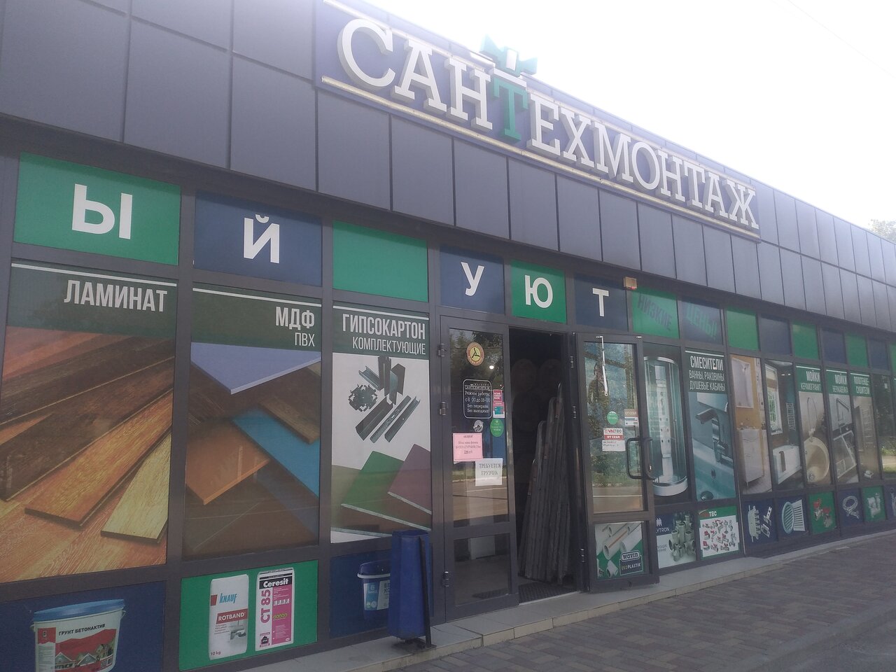 Большой выбор сантехники. Есть практически все наименования. (На фото не тот магазин. Сантехмонтаж — это синий магазин слева. На фото видно кусочек)